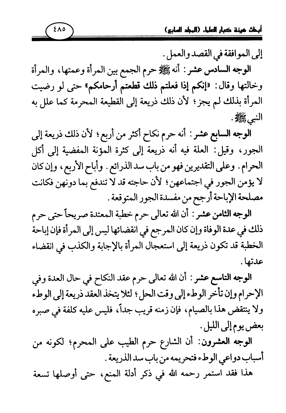الوجه السادس عشر: أنه - صلى الله عليه وسلم - حرم الجمع بين المرأة وعمتها، والمرأة وخالتها وقال: «إنكم إذا فعلتم ذلك قطعتم أرحامكم» حتى لو رضيت المرأة بذلك لم يجز؛ لأن ذلك ذريعة إلى القطيعة المحرمة كما علل به النبي صلى الله عليه وسلم.