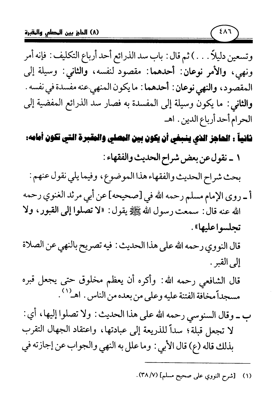ب- وقال السنوسي رحمه الله على هذا الحديث: ولا تصلوا إليها، أي: لا تجعل قبلة؛ سدا للذريعة إلى عبادتها، واعتقاد الجهال التقرب بذلك قاله (ع) قال الأبي: وما علل به النهي والجواب عن إجازته في