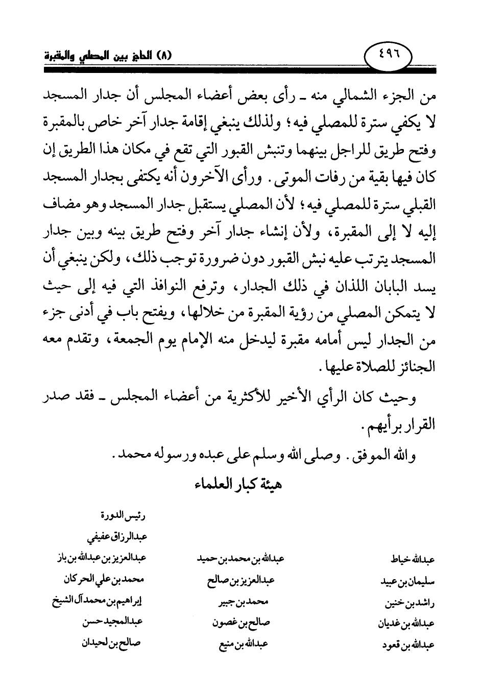 ورأى الآخرون أنه يكتفى بجدار المسجد القبلي سترة للمصلي فيه؛ لأن المصلي يستقبل جدار المسجد وهو مضاف إليه لا إلى المقبرة، ولأن إنشاء جدار آخر وفتح طريق بينه وبين جدار المسجد يترتب عليه نبش القبور دون ضرورة توجب ذلك، ولكن ينبغي أن يسد البابان اللذان في ذلك الجدار، وترفع النوافذ التي فيه إلى حيث لا يتمكن المصلي من رؤية المقبرة من خلالها، ويفتح باب في أدنى جزء من الجدار ليس أمامه مقبرة ليدخل منه الإمام يوم الجمعة، وتقدم معه الجنائز للصلاة عليها.
