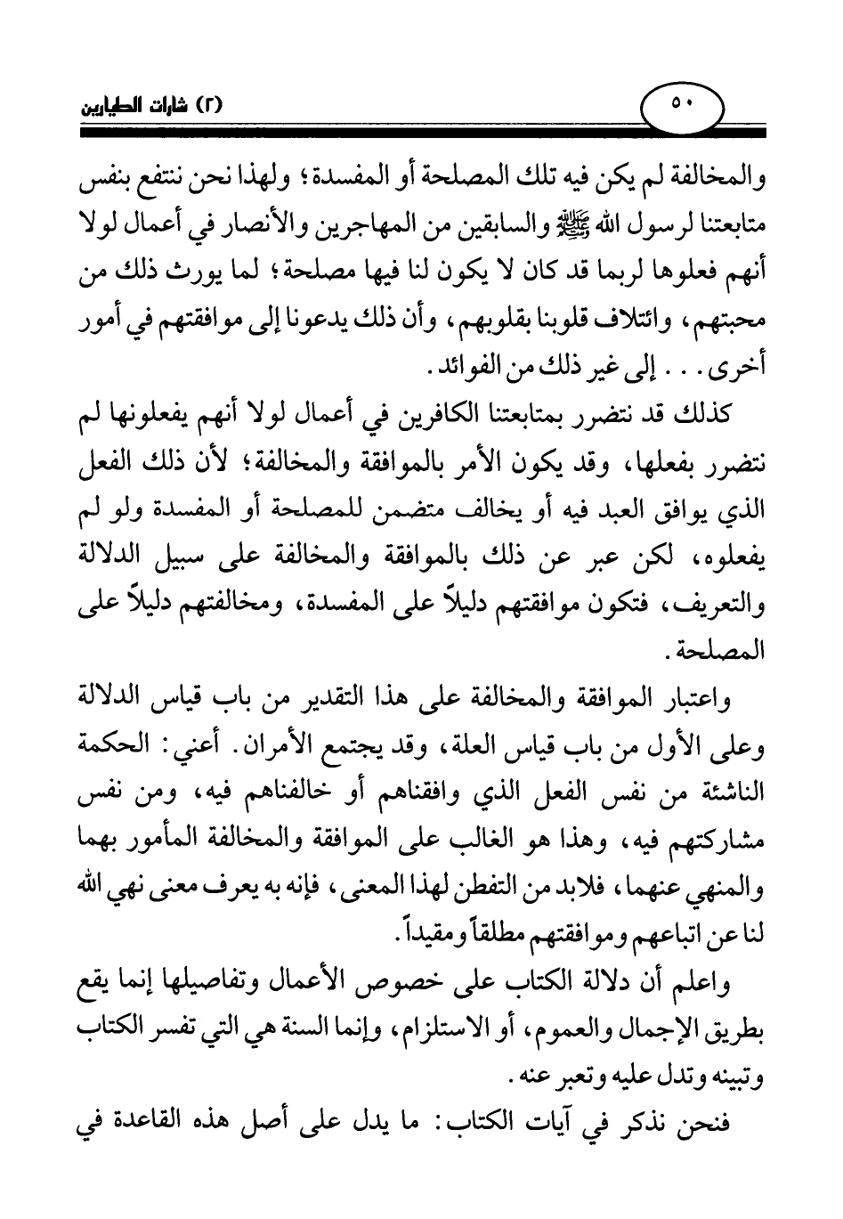 واعتبار الموافقة والمخالفة على هذا التقدير من باب قياس الدلالة وعلى الأول من باب قياس العلة، وقد يجتمع الأمران. أعني: الحكمة الناشئة من نفس الفعل الذي وافقناهم أو خالفناهم فيه، ومن نفس مشاركتهم فيه، وهذا هو الغالب على الموافقة والمخالفة المأمور بهما والمنهي عنهما، فلا بد من التفطن لهذا المعنى، فإنه به يعرف معنى نهي الله لنا عن اتباعهم وموافقتهم مطلقا ومقيدا.