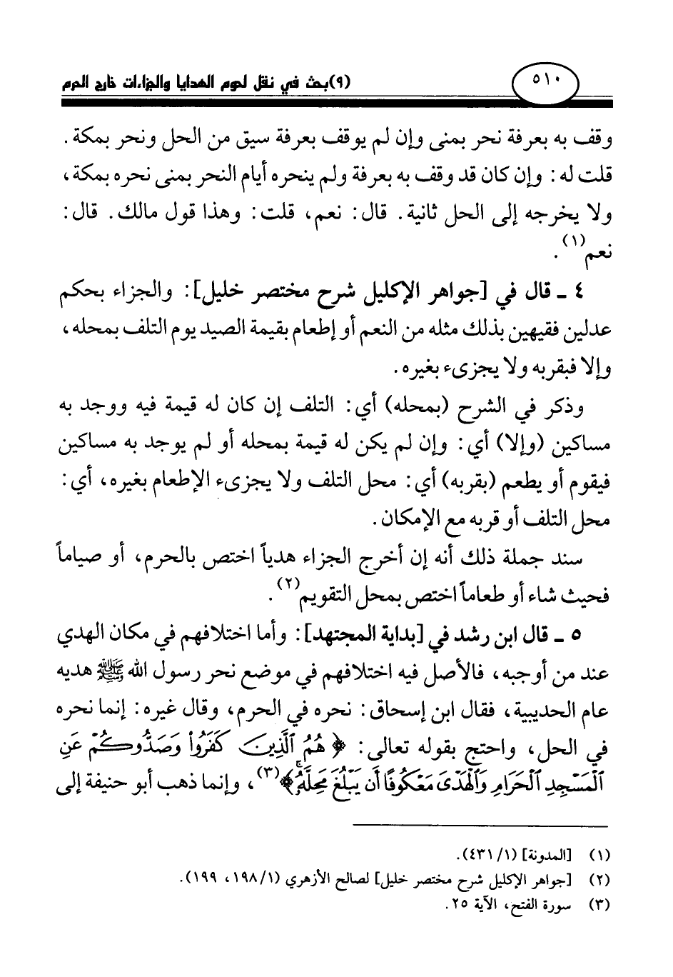 5 - قال ابن رشد في [بداية المجتهد] : وأما اختلافهم في مكان الهدي عند من أوجبه، فالأصل فيه اختلافهم في موضع نحر رسول الله صلى الله عليه وسلم هديه عام الحديبية، فقال ابن إسحاق: نحره في الحرم، وقال غيره: إنما نحره في الحل، واحتج بقوله تعالى: {هُمُ الَّذِينَ كَفَرُوا وَصَدُّوكُمْ عَنِ الْمَسْجِدِ الْحَرَامِ وَالْهَدْيَ مَعْكُوفًا أَنْ يَبْلُغَ مَحِلَّهُ} (¬3) وإنما ذهب أبو حنيفة إلى