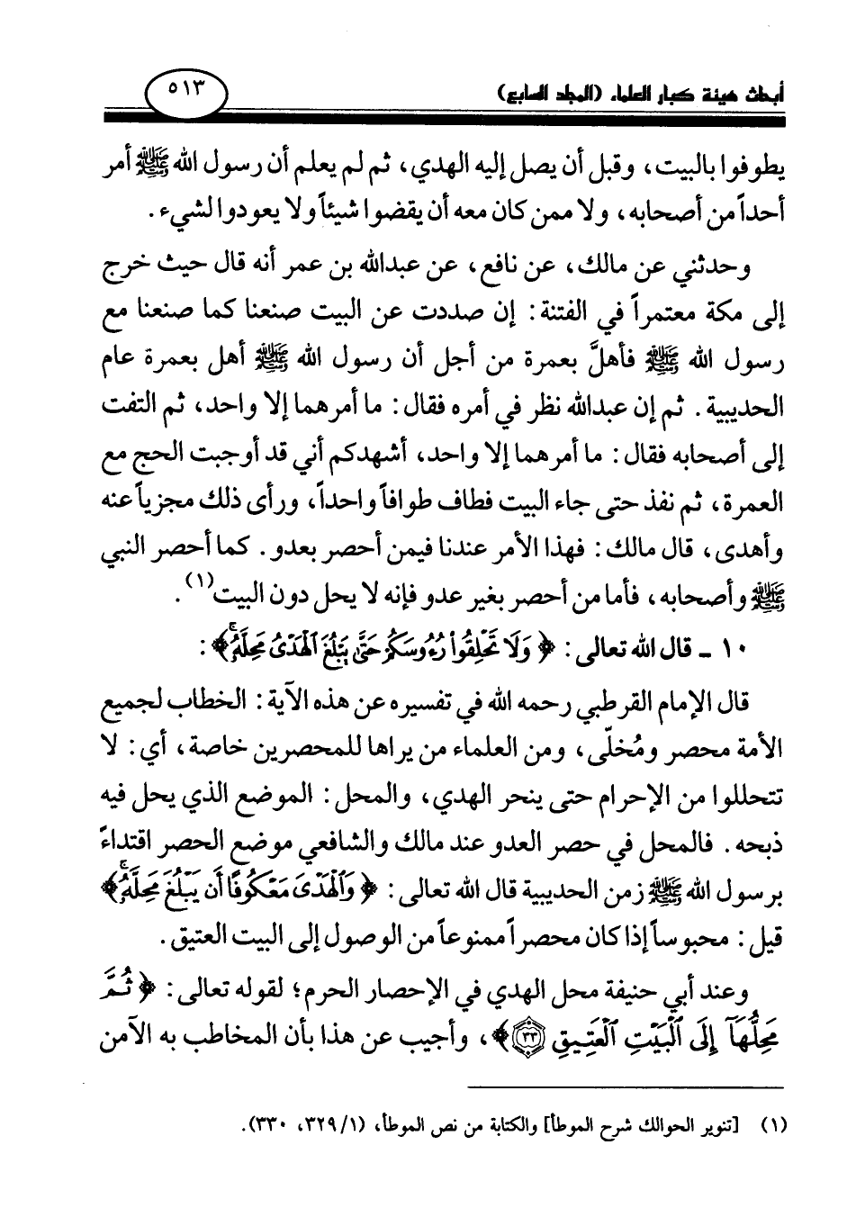 قال الإمام القرطبي - رحمه الله - في تفسيره عن هذه الآية: الخطاب لجميع الأمة محصر ومخلى، ومن العلماء من يراها للمحصرين خاصة، أي: لا تتحللوا من الإحرام حتى ينحر الهدي، والمحل: الموضع الذي يحل فيه ذبحه.