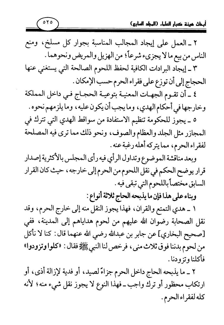 5 - يجوز للحكومة تنظيم الاستفادة من سواقط الهدي التي تترك في المجازر مثل الجلد والعظام والصوف، ونحو ذلك مما ترى فيه المصلحة لفقراء الحرم، مما يتركه أهله رغبة عنه.