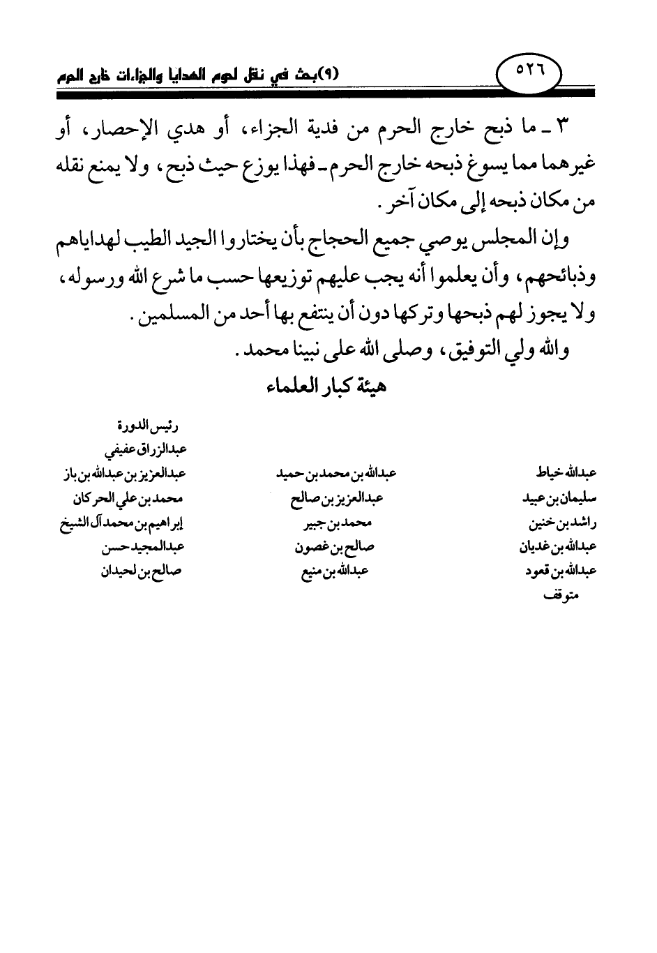 وإن المجلس يوصي جميع الحجاج بأن يختاروا الجيد الطيب لهداياهم وذبائحهم، وأن يعلموا أنه يجب عليهم توزيعها حسب ما شرع الله ورسوله، ولا يجوز لهم ذبحها وتركها دون أن ينتفع بها أحد من المسلمين.