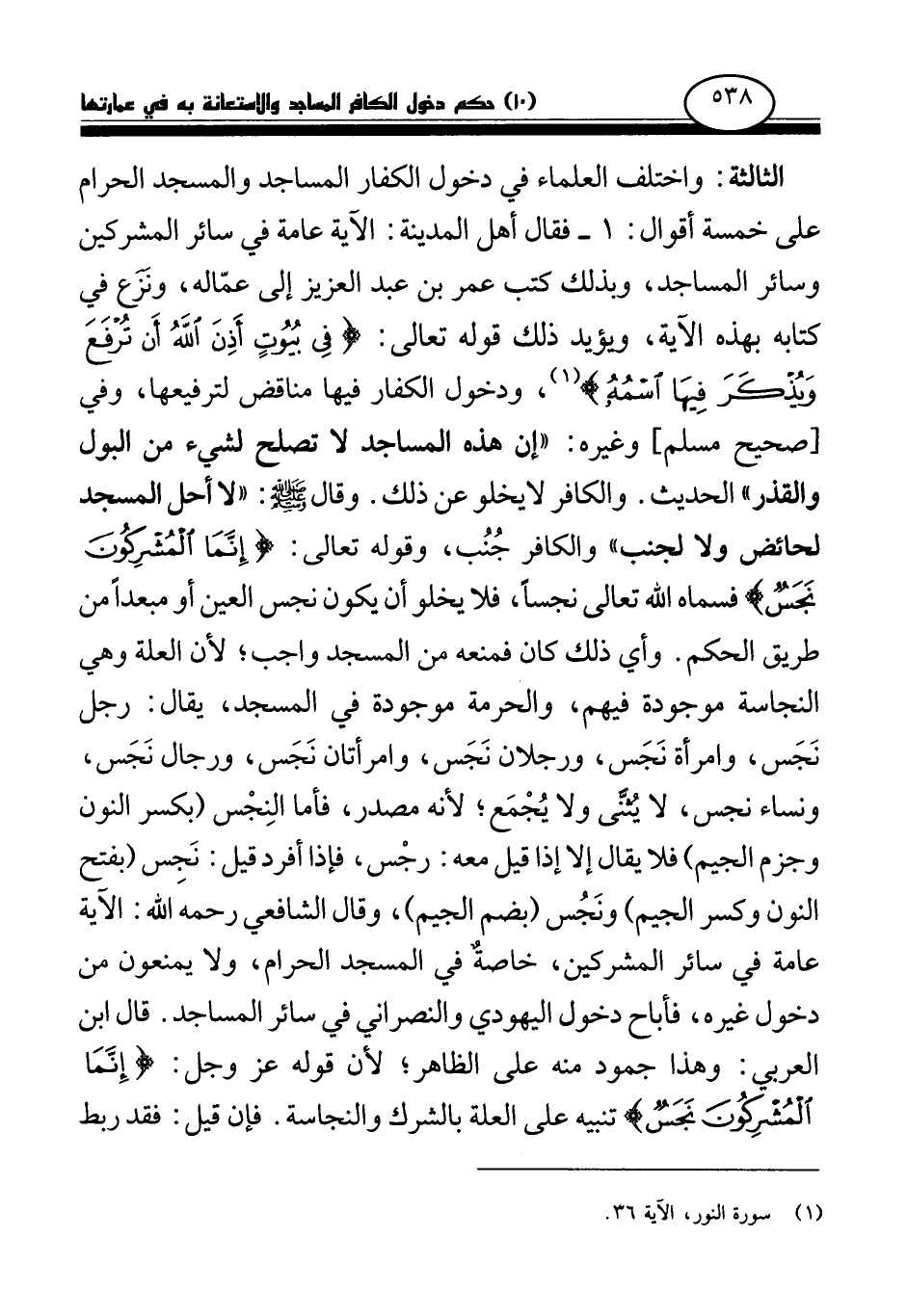 الثالثة: واختلف العلماء في دخول الكفار المساجد والمسجد الحرام على خمسة أقوال: 1 - فقال أهل المدينة: الآية عامة في سائر المشركين وسائر المساجد، وبذلك كتب عمر بن عبد العزيز إلى عماله، ونزع في كتابه بهذه الآية، ويؤيد ذلك قوله تعالى: {فِي بُيُوتٍ أَذِنَ اللَّهُ أَنْ تُرْفَعَ وَيُذْكَرَ فِيهَا اسْمُهُ} (¬1) ودخول الكفار فيها مناقض لترفيعها