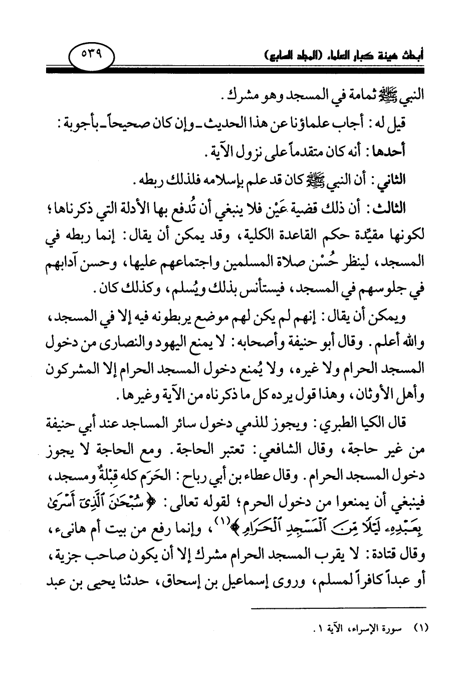 ويمكن أن يقال: إنهم لم يكن لهم موضع يربطونه فيه إلا في المسجد، والله أعلم. وقال أبو حنيفة وأصحابه: لا يمنع اليهود والنصارى من دخول المسجد الحرام ولا غيره، ولا يمنع دخول المسجد الحرام إلا المشركون وأهل الأوثان، وهذا قول يرده كل ما ذكرناه من الآية وغيرها.