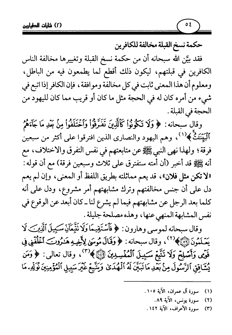 فقد بين الله سبحانه أن من حكمة نسخ القبلة وتغييرها مخالفة الناس الكافرين في قبلتهم، ليكون ذلك أقطع لما يطمعون فيه من الباطل، ومعلوم أن هذا المعنى ثابت في كل مخالفة وموافقة، فإن الكافر إذا اتبع في شيء من أمره كان له في الحجة مثل ما كان أو قريب مما كان لليهود من الحجة في القبلة.