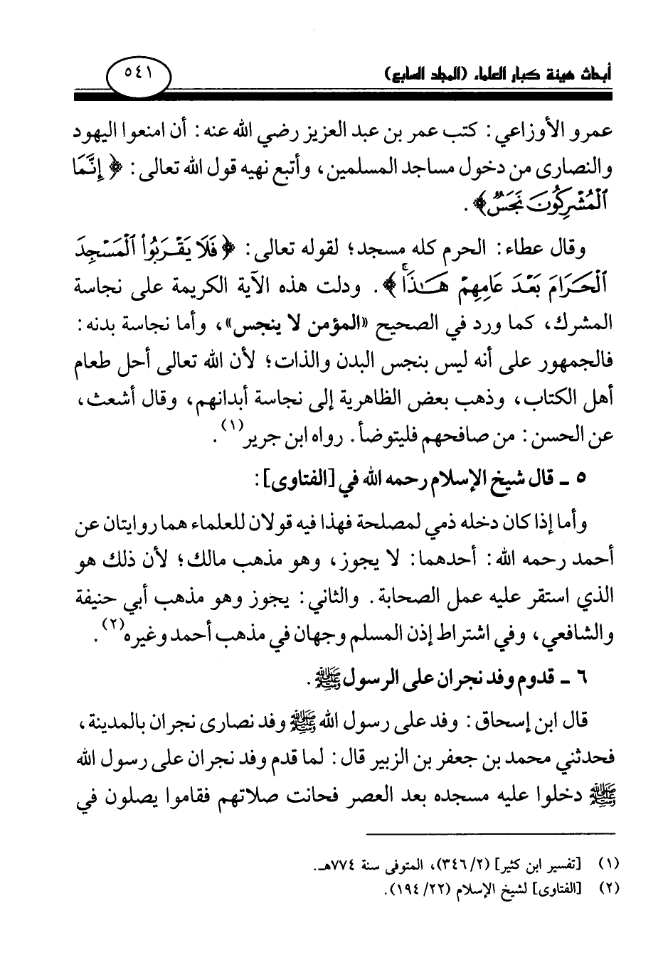 عمرو الأوزاعي: كتب عمر بن عبد العزيز رضي الله عنه: أن امنعوا اليهود والنصارى من دخول مساجد المسلمين، وأتبع نهيه قول الله تعالى: {إِنَّمَا الْمُشْرِكُونَ نَجَسٌ} (¬1)