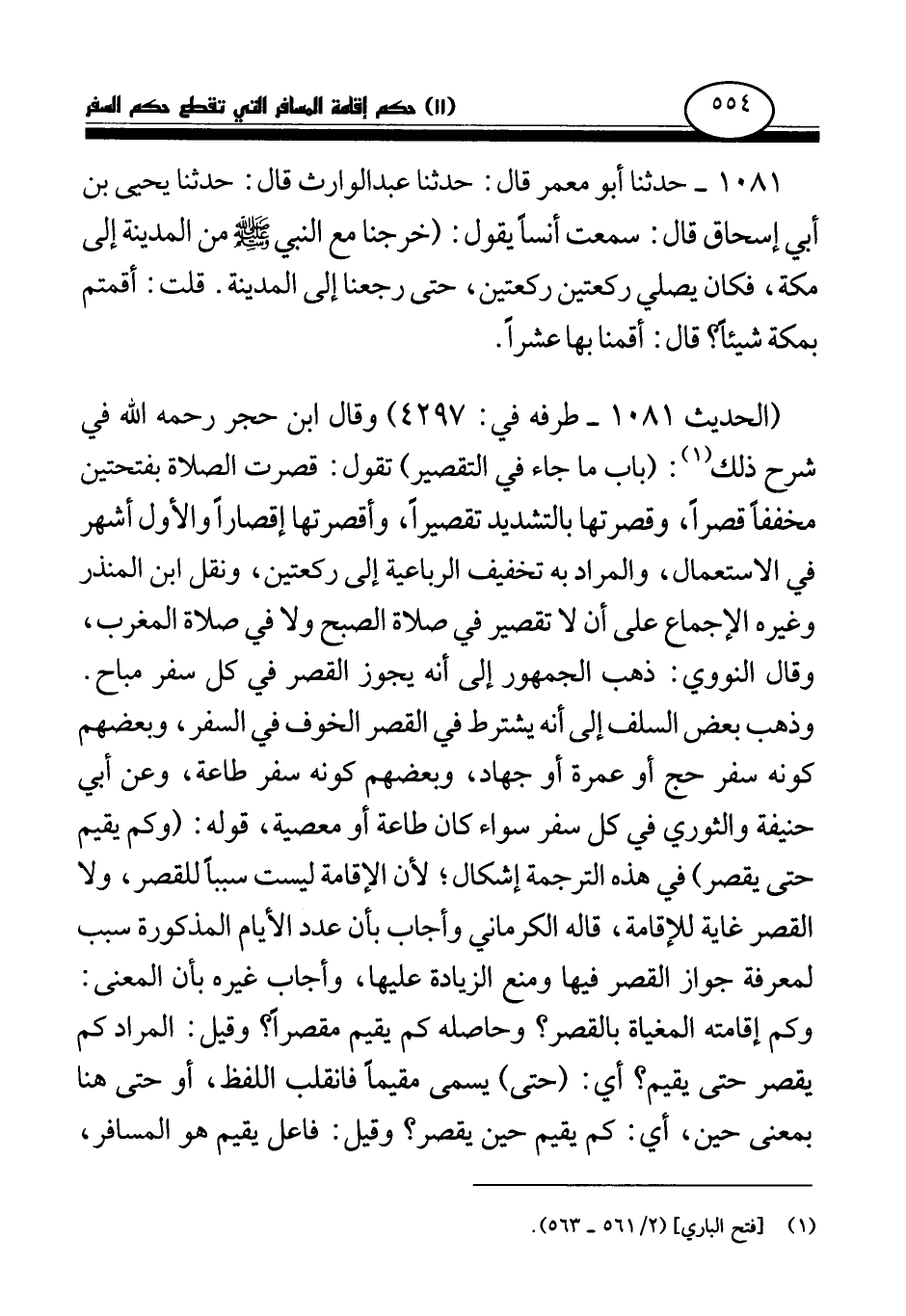 (الحديث 1081 - طرفه في: 4297) وقال ابن حجر رحمه الله في شرح ذلك (¬2) : (باب ما جاء في التقصير) تقول: قصرت الصلاة بفتحتين مخففا قصرا، وقصرتها بالتشديد تقصيرا، وأقصرتها إقصارا والأول أشهر في الاستعمال، والمراد به تخفيف الرباعية إلى ركعتين، ونقل ابن المنذر وغيره الإجماع على أن لا تقصير في صلاة الصبح ولا في صلاة المغرب، وقال النووي: ذهب الجمهور إلى أنه يجوز القصر في كل سفر مباح.