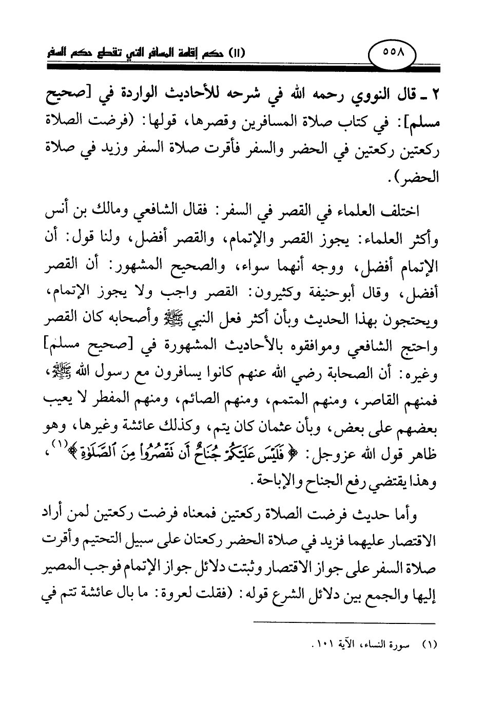2 - قال النووي رحمه الله في شرحه للأحاديث الواردة في [صحيح مسلم] : في كتاب صلاة المسافرين وقصرها، قولها: (فرضت الصلاة ركعتين ركعتين في الحضر والسفر فأقرت صلاة السفر وزيد في صلاة الحضر) .