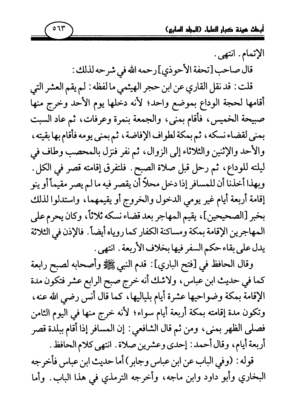 وقال الحافظ في [فتح الباري] : «قدم النبي صلى الله عليه وسلم وأصحابه لصبح رابعة (¬2) » كما في حديث ابن عباس، ولاشك أنه خرج صبح الرابع عشر فتكون مدة الإقامة بمكة وضواحيها عشرة أيام بلياليها، كما قال أنس رضي الله عنه، وتكون مدة إقامته بمكة أربعة أيام سواء؛ لأنه خرج منها في اليوم الثامن فصلى الظهر بمنى، ومن ثم قال الشافعي: إن المسافر إذا أقام ببلدة قصر أربعة أيام، وقال أحمد: إحدى وعشرين صلاة. انتهى كلام الحافظ.
