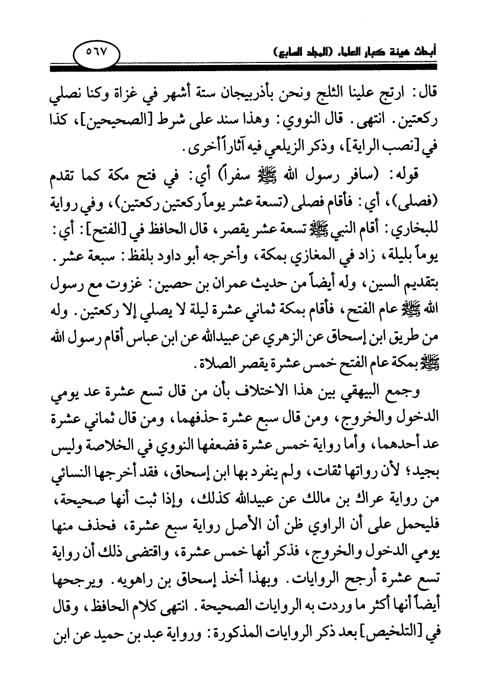 وأما رواية «خمسة عشر (¬5) » فضعفها النووي في الخلاصة، وليس بجيد؛ لأن رواتها ثقات، ولم ينفرد بها ابن إسحاق، فقد أخرجها النسائي من رواية عراك بن مالك عن عبيد الله كذلك، وإذا ثبت أنها صحيحة فليحمل على أن الراوي ظن أن الأصل رواية سبع عشرة، فحذف منها يومي الدخول والخروج فذكر أنها خمسة عشر، واقتضى ذلك أن رواية تسعة عشر أرجح الروايات، وبهذا أخذ إسحاق بن راهويه، ويرجحها أيضا أنها أكثر ما وردت به الروايات الصحيحة. انتهى كلام الحافظ، وقال في [التلخيص] بعد ذكر الروايات المذكورة: ورواية عبد بن حميد عن ابن