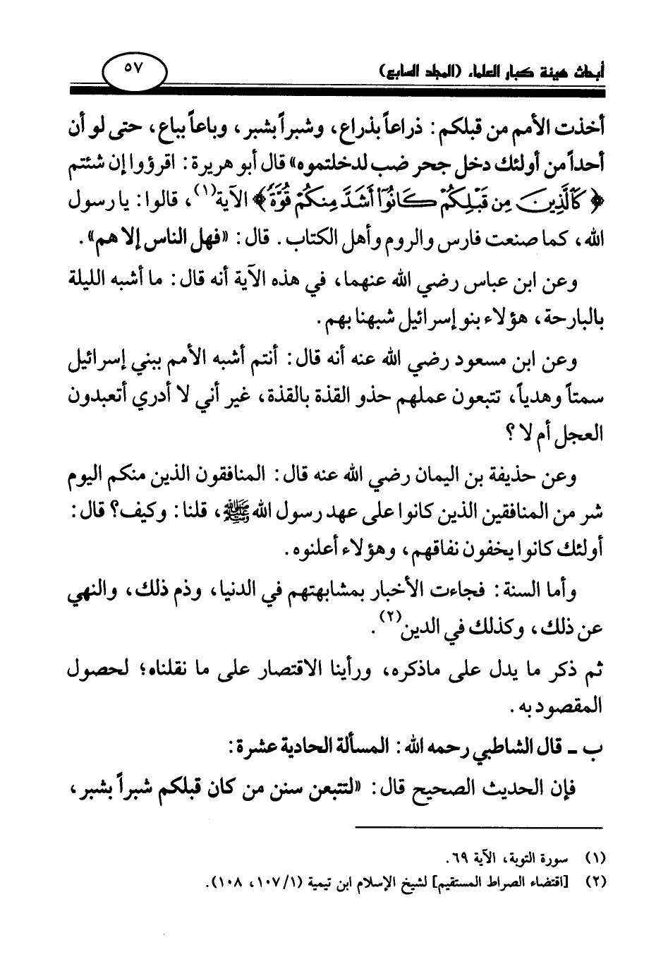 أخذت الأمم من قبلكم: ذراعا بذراع، وشبرا بشبر، وباعا بباع، حتى لو أن أحدا من أولئك دخل جحر ضب لدخلتموه قال أبو هريرة: اقرؤوا إن شئتم الآية، قالوا: يا رسول الله، كما صنعت فارس والروم وأهل الكتاب. قال: فهل الناس إلا هم (¬2) » .