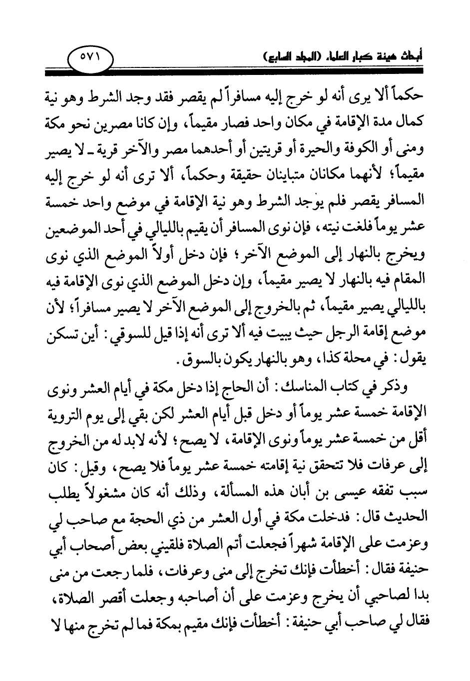 وذكر في كتاب المناسك: أن الحاج إذا دخل مكة في أيام العشر ونوى الإقامة خمسة عشر يوما أو دخل قبل أيام العشر لكن بقي إلى يوم التروية أقل من خمسة عشر يوما ونوى الإقامة، لا يصح؛ لأنه لا بد له من الخروج إلى عرفات فلا تتحقق نية إقامته خمسة عشر يوما فلا يصح، وقيل: كان سبب تفقه عيسى بن أبان هذه المسألة، وذلك أنه كان مشغولا يطلب الحديث قال: فدخلت مكة في أول العشر من ذي الحجة مع صاحب لي وعزمت على الإقامة شهرا فجعلت أتم الصلاة فلقيني بعض أصحاب أبي حنيفة فقال: أخطأت فإنك تخرج إلى منى وعرفات، فلما رجعت من منى بدا لصاحبي أن يخرج وعزمت على أن أصاحبه وجعلت أقصر الصلاة، فقال لي صاحب أبي حنيفة: أخطأت فإنك مقيم بمكة فما لم تخرج منها لا