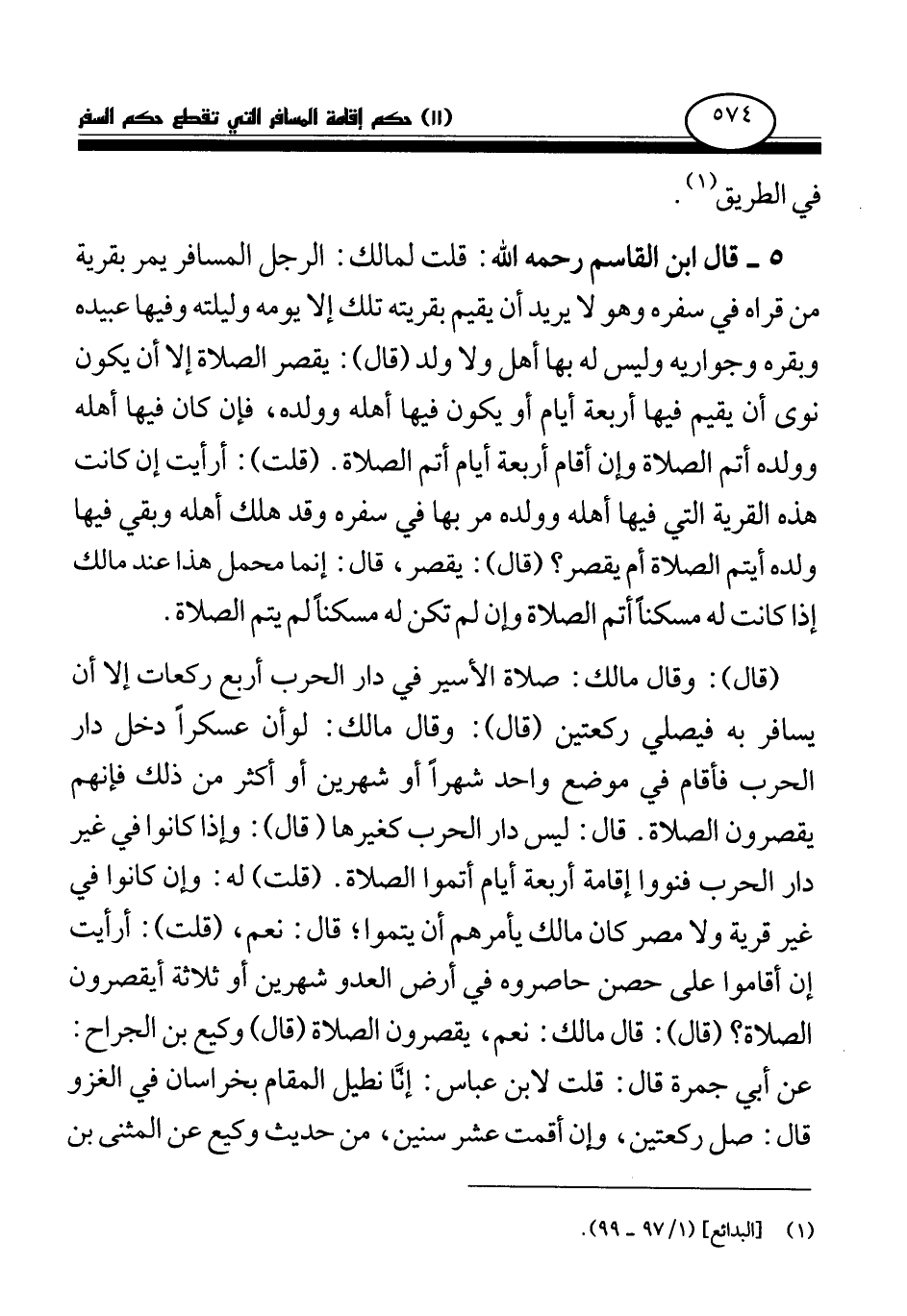 5 - قال ابن القاسم رحمه الله: قلت لمالك: الرجل المسافر يمر بقرية من قراه في سفره وهو لا يريد أن يقيم بقريته تلك إلا يومه وليلته وفيها عبيده وبقره وجواريه وليس له بها أهل ولا ولد (قال) : يقصر الصلاة إلا أن يكون نوى أن يقيم فيها أربعة أيام أو يكون فيها أهله وولده، فإن كان فيها أهله وولده أتم الصلاة وإن أقام أربعة أيام أتم الصلاة. (قلت) : أرأيت إن كانت هذه القرية التي فيها أهله وولده مر بها في سفره وقد هلك أهله وبقي فيها ولده أيتم الصلاة أم يقصر؟ (قال) : يقصر، قال: إنما محمل هذا عند مالك إذا كانت له مسكنا أتم الصلاة وإن لم تكن له مسكنا لم يتم الصلاة.