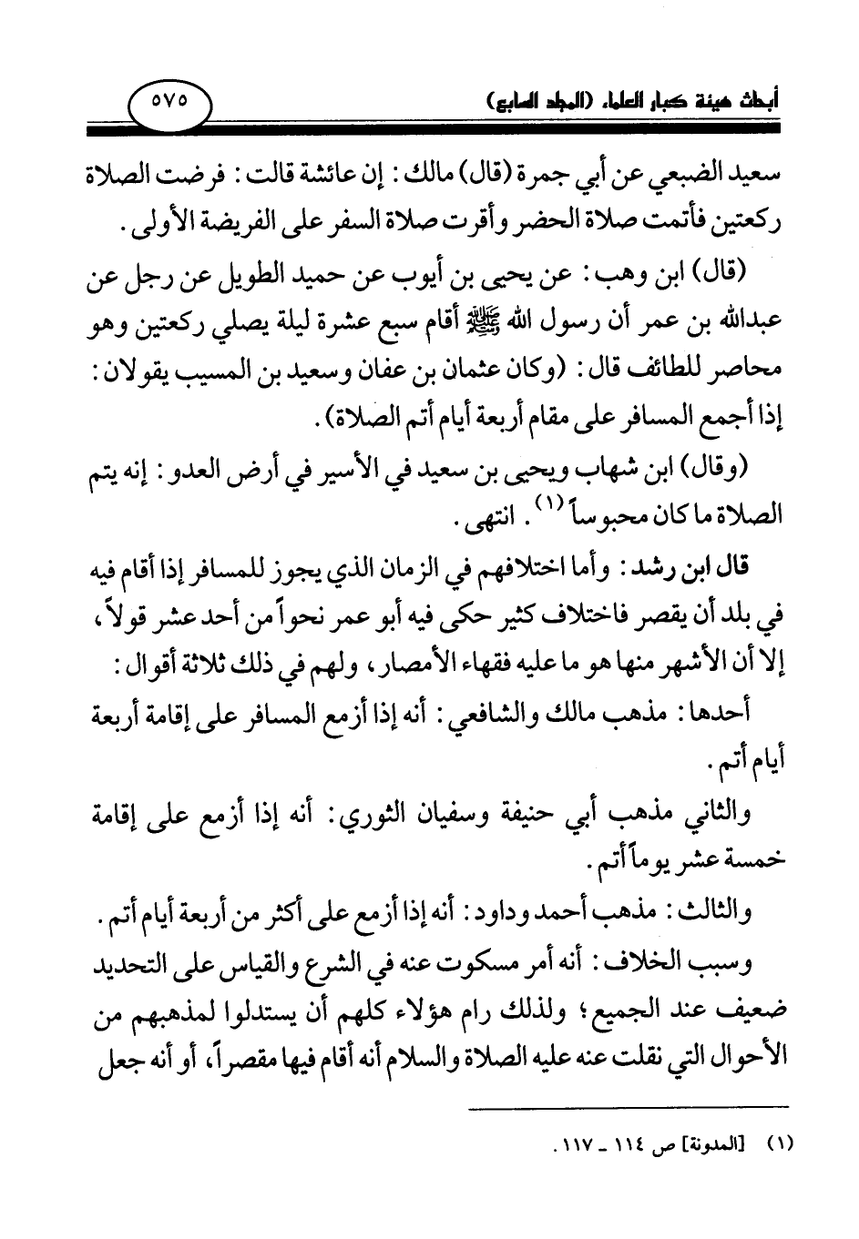 (قال) ابن وهب: عن يحيى بن أيوب عن حميد الطويل عن رجل عن عبد الله بن عمر «أن رسول الله صلى الله عليه وسلم أقام سبع عشرة ليلة يصلي ركعتين وهو محاصر للطائف» قال: (وكان عثمان بن عفان وسعيد بن المسيب يقولان: إذا أجمع المسافر على مقام أربعة أيام أتم الصلاة) .