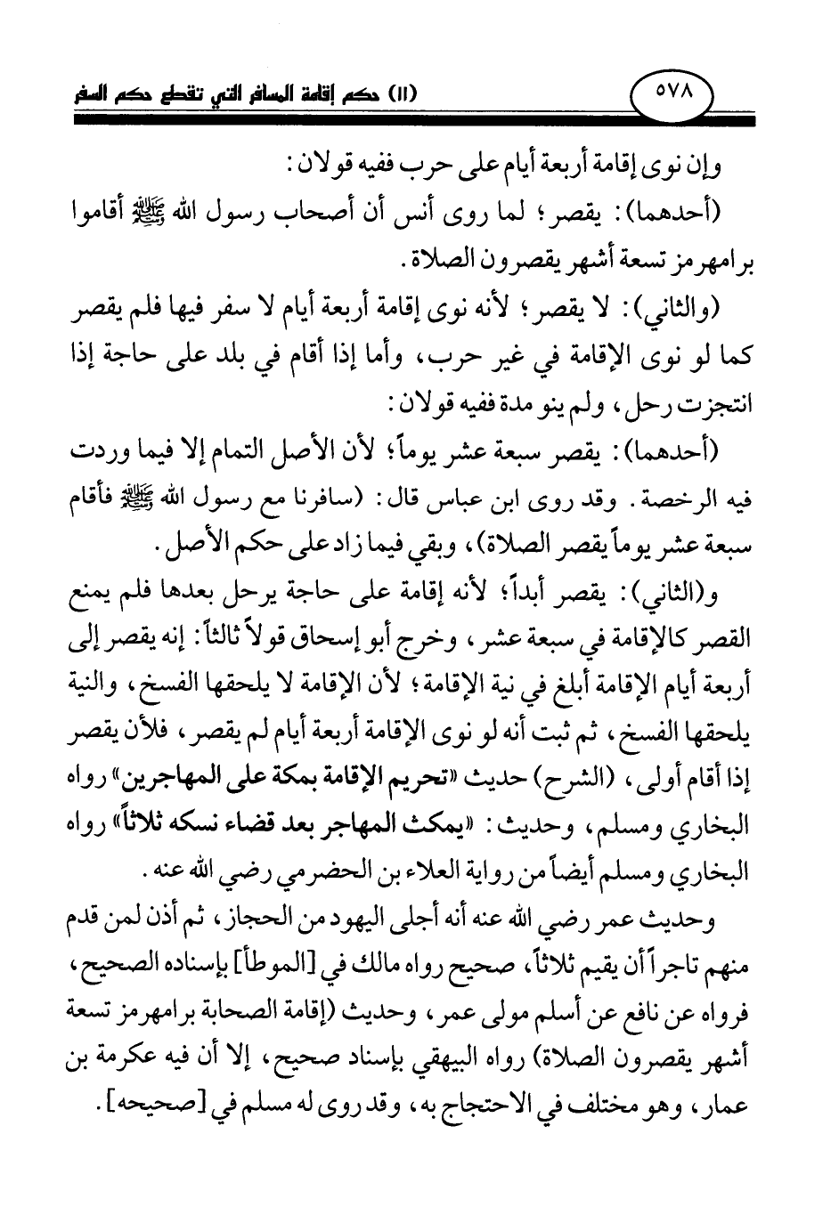 وحديث عمر رضي الله عنه أنه أجلى اليهود من الحجاز، ثم أذن لمن قدم منهم تاجرا أن يقيم ثلاثا، صحيح رواه مالك في [الموطأ] بإسناده الصحيح، فرواه عن نافع عن أسلم مولى عمر، وحديث «إقامة الصحابة برامهرمز تسعة أشهر يقصرون الصلاة» رواه البيهقي بإسناد صحيح، إلا أن فيه عكرمة بن عمار، وهو مختلف في الاحتجاج به، وقد روى له مسلم في [صحيحه] .