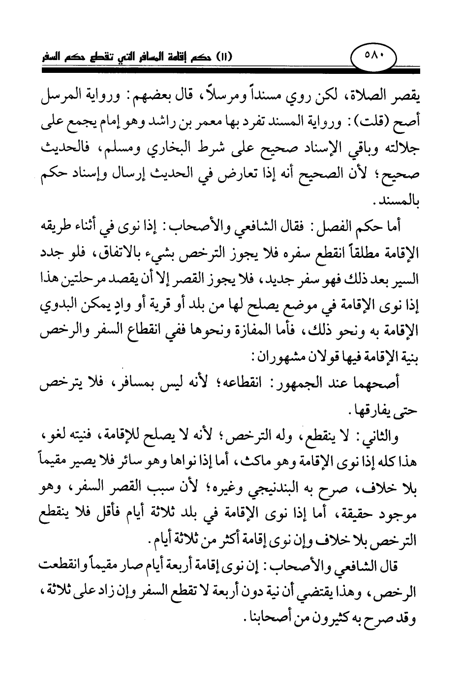والثاني: لا ينقطع، وله الترخص؛ لأنه لا يصلح للإقامة، فنيته لغو، هذا كله إذا نوى الإقامة وهو ماكث، أما إذا نواها وهو سائر فلا يصير مقيما بلا خلاف، صرح به البندنيجي وغيره؛ لأن سبب القصر السفر، وهو موجود حقيقة، أما إذا نوى الإقامة في بلد ثلاثة أيام فأقل فلا ينقطع الترخص بلا خلاف وإن نوى إقامة أكثر من ثلاثة أيام.