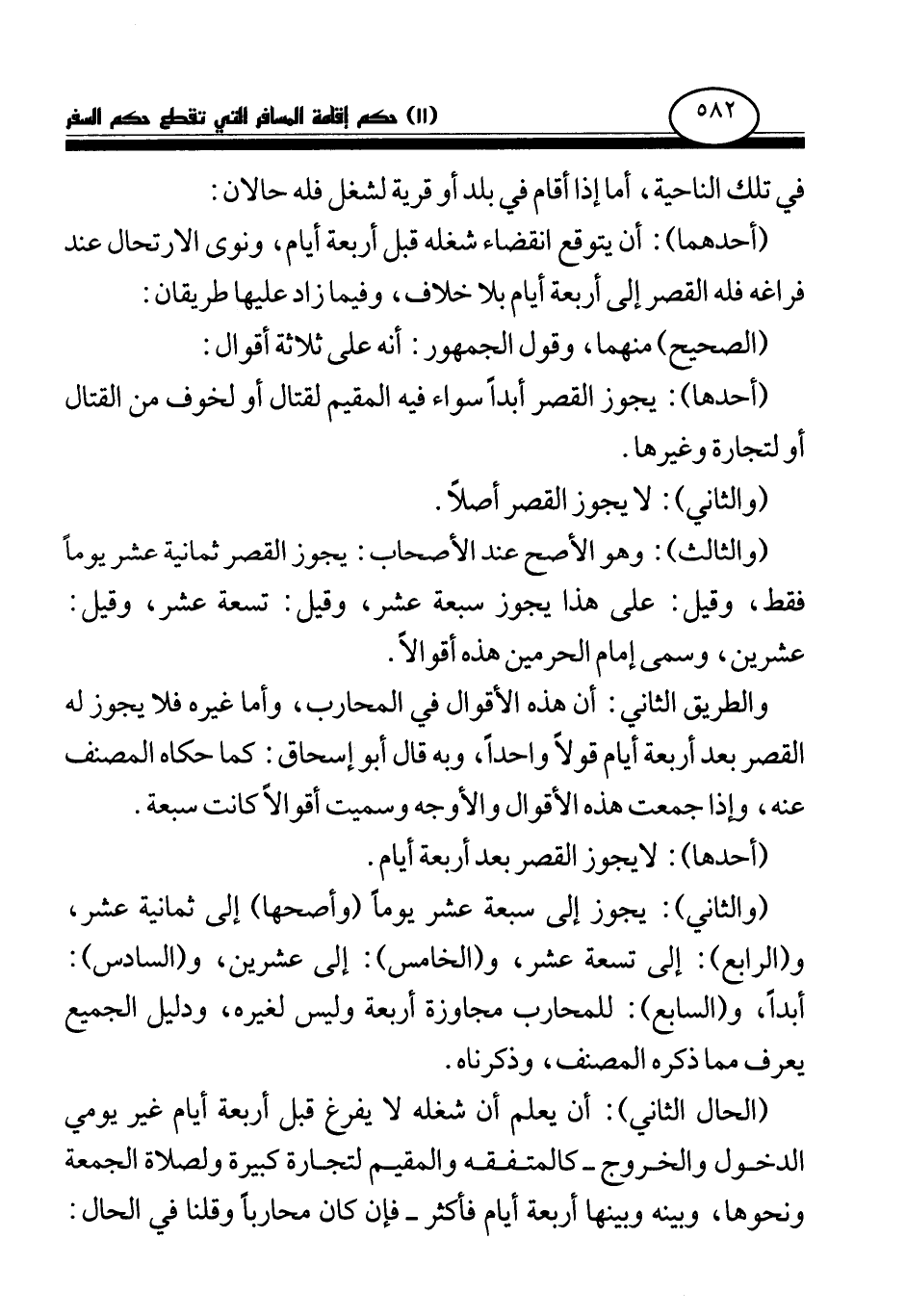 (الحال الثاني) : أن يعلم أن شغله لا يفرغ قبل أربعة أيام غير يومي الدخول والخروج- كالمتفقه والمقيم لتجارة كبيرة ولصلاة الجمعة ونحوها، وبينه وبينها أربعة أيام فأكثر- فإن كان محاربا وقلنا في الحال:
