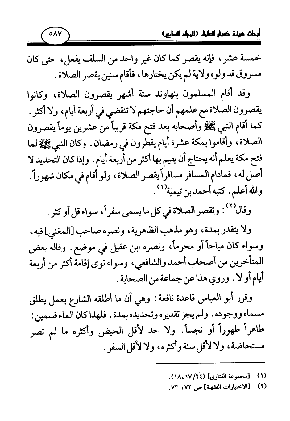 وقد أقام المسلمون بنهاوند ستة أشهر يقصرون الصلاة، وكانوا يقصرون الصلاة مع علمهم أن حاجتهم لا تنقضي في أربعة أيام، ولا أكثر. كما «أقام النبي صلى الله عليه وسلم وأصحابه بعد فتح مكة قريبا من عشرين يوما يقصرون الصلاة، وأقاموا بمكة عشرة أيام يفطرون في رمضان» . وكان النبي صلى الله عليه وسلم لما فتح مكة يعلم أنه يحتاج أن يقيم بها أكثر من أربعة أيام. وإذا كان التحديد لا أصل له، فمادام المسافر مسافرا يقصر الصلاة، ولو أقام في مكان شهورا. والله أعلم. كتبه أحمد بن تيمية (¬1) .