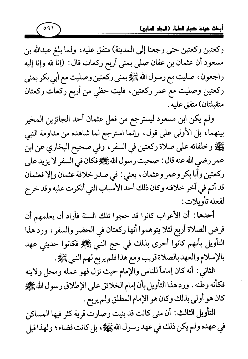 ولم يكن ابن مسعود ليسترجع من فعل عثمان أحد الجائزين المخير بينهما، بل الأولى على قول، وإنما استرجع لما شاهده من مداومة النبي صلى الله عليه وسلم وخلفائه على صلاة ركعتين في السفر، وفي صحيح البخاري عن ابن عمر رضي الله عنه قال: «صحبت رسول الله صلى الله عليه وسلم فكان في السفر لا يزيد على ركعتين وأبا بكر وعمر وعثمان، (¬3) » يعني: في صدر خلافة عثمان وإلا فعثمان قد أتم في آخر خلافته وكان ذلك أحد الأسباب التي أنكرت عليه وقد خرج لفعله تأويلات: