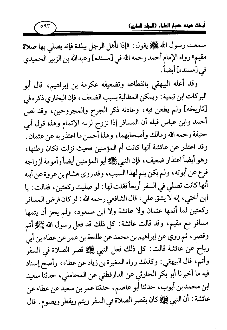 وقد أعله البيهقي بانقطاعه وتضعيفه عكرمة بن إبراهيم، قال أبو البركات ابن تيمية: ويمكن المطالبة بسبب الضعف، فإن البخاري ذكره في [تاريخه] ولم يطعن فيه، وعادته ذكر الجرح والمجروحين، وقد نص أحمد وابن عباس قبله أن المسافر إذا تزوج لزمه الإتمام وهذا قول أبي حنيفة رحمه الله ومالك وأصحابهما، وهذا أحسن ما اعتذر به عن عثمان. وقد اعتذر عن عائشة أنها كانت أم المؤمنين فحيث نزلت فكان وطنها، وهو أيضا اعتذار ضعيف، فإن النبي صلى الله عليه وسلم أبو المؤمنين أيضا وأمومة أزواجه فرع عن أبوته، ولم يكن يتم لهذا السبب، وقد روى هشام بن عروة عن أبيه أنها كانت تصلي في السفر أربعا فقلت لها: لو صليت ركعتين، فقالت: يا ابن أختي، إنه لا يشق علي، قال الشافعي رحمه الله: لو كان فرض المسافر ركعتين لما أتمها عثمان ولا عائشة ولا ابن مسعود، ولم يجز أن يتمها مسافر مع مقيم،. وقد قالت عائشة: كل ذلك قد فعل رسول الله صلى الله عليه وسلم أتم وقصر، ثم روي عن إبراهيم بن محمد عن طلحة بن عمر عن عطاء بن أبي رباح عن عائشة «قالت: كل ذلك فعل النبي صلى الله عليه وسلم قصر الصلاة في السفر وأتم،» قال البيهقي: وكذلك رواه المغيرة بن زياد عن عطاء، وأصح إسناد فيه ما أخبرنا أبو بكر الحارثي عن الدارقطني عن المحاملي، حدثنا سعيد ابن محمد بن أيوب، حدثنا أبو عاصم، حدثنا عمر بن سعيد عن عطاء عن عائشة: أن النبي صلى الله عليه وسلم «كان يقصر الصلاة في السفر ويتم ويفطر ويصوم» . قال