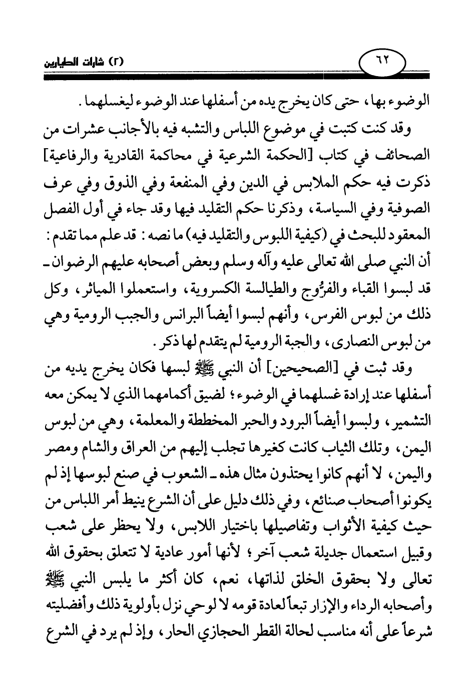 وقد كنت كتبت في موضوع اللباس والتشبه فيه بالأجانب عشرات من الصحائف في كتاب [الحكمة الشرعية في محاكمة القادرية والرفاعية] ذكرت فيه حكم الملابس في الدين وفي المنفعة وفي الذوق وفي عرف الصوفية وفي السياسة، وذكرنا حكم التقليد فيها وقد جاء في أول الفصل المعقود للبحث في (كيفية اللبوس والتقليد فيه) ما نصه: قد علم مما تقدم: أن النبي صلى الله تعالى عليه وآله وسلم وبعض أصحابه عليهم الرضوان- قد لبسوا القباء والفروج والطيالسة الكسروية، واستعملوا المياثر، وكل ذلك من لبوس الفرس، وأنهم لبسوا أيضا البرانس والجبب الرومية وهي من لبوس النصارى، والجبة الرومية لم يتقدم لها ذكر.