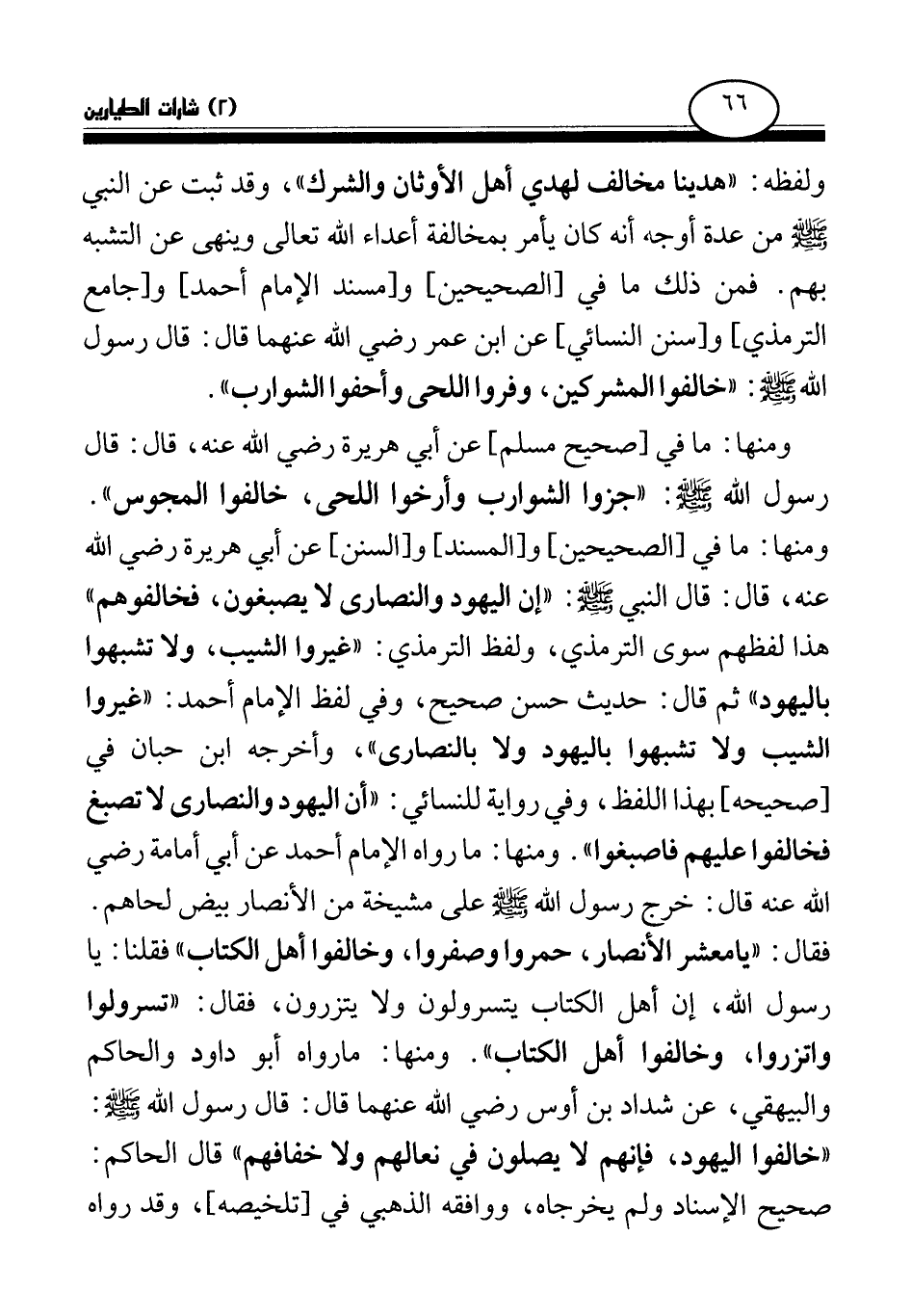 ومنها: ما في [صحيح مسلم] عن أبي هريرة رضي الله عنه، قال: قال رسول الله صلى الله عليه وسلم: «جزوا الشوارب وأرخوا اللحى، خالفوا المجوس (¬2) » . ومنها: ما في [الصحيحين] و [المسند] و [السنن] عن أبي هريرة رضي الله عنه، قال: قال النبي صلى الله عليه وسلم: «إن اليهود والنصارى لا يصبغون، فخالفوهم (¬3) » هذا لفظهم سوى الترمذي، ولفظ الترمذي: «غيروا الشيب، ولا تشبهوا باليهود (¬4) » ثم قال: حديث حسن صحيح، وفي لفظ الإمام أحمد: «غيروا الشيب ولا تشبهوا باليهود ولا بالنصارى (¬5) » ، وأخرجه ابن حبان في [صحيحه] بهذا اللفظ، وفي رواية للنسائي: «أن اليهود والنصارى لا تصبغ فخالفوا عليهم فاصبغوا (¬6) » . ومنها: ما رواه الإمام أحمد عن أبي أمامة رضي الله عنه قال: «خرج رسول الله صلى الله عليه وسلم على مشيخة من الأنصار بيض لحاهم فقال: يا معشر الأنصار، حمروا وصفروا، وخالفوا أهل الكتاب فقلنا: يا رسول الله، إن أهل الكتاب يتسرولون ولا يتزرون، فقال: تسرولوا واتزروا، وخالفوا أهل الكتاب (¬7) » . ومنها: ما رواه أبو داود والحاكم والبيهقي، عن شداد بن أوس رضي الله عنهما قال: قال رسول الله صلى الله عليه وسلم: «خالفوا اليهود، فإنهم لا يصلون في نعالهم ولا خفافهم (¬8) » قال الحاكم: صحيح الإسناد ولم يخرجاه، ووافقه الذهبي في [تلخيصه] ، وقد رواه