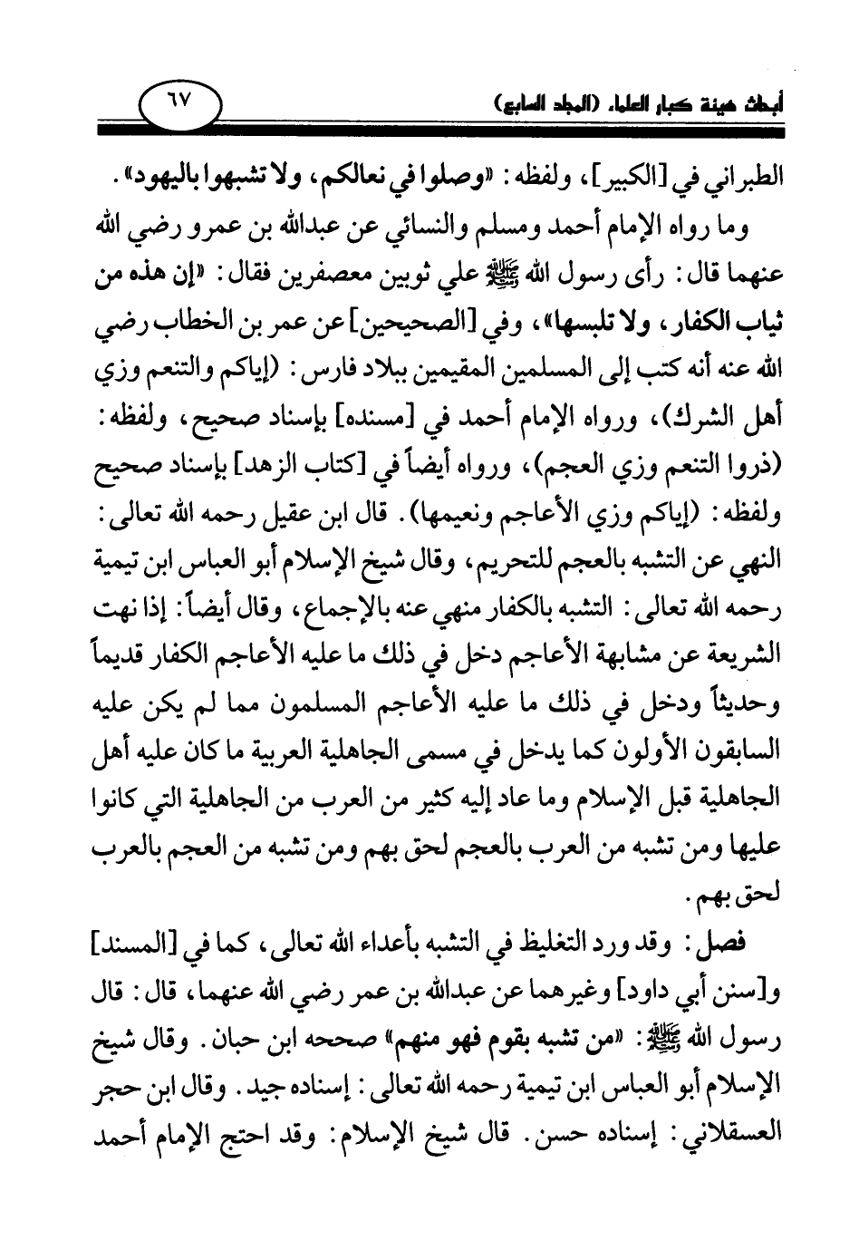 فصل: وقد ورد التغليظ في التشبه بأعداء الله تعالى، كما في [المسند] و [سنن أبي داود] وغيرهما عن عبد الله بن عمر رضي الله عنهما، قال: قال رسول الله صلى الله عليه وسلم: «من تشبه بقوم فهو منهم (¬2) » صححه ابن حبان. وقال شيخ الإسلام أبو العباس ابن تيمية رحمه الله تعالى: إسناده جيد. وقال ابن حجر العسقلاني: إسناده حسن. قال شيخ الإسلام: وقد احتج الإمام أحمد