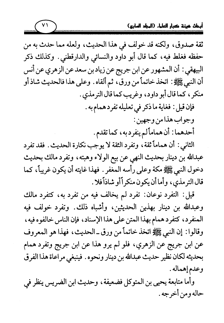الثاني: أن هماما ثقة، وتفرد الثقة لا يوجب نكارة الحديث. فقد تفرد عبد الله بن دينار بحديث النهي عن بيع الولاء وهبته، وتفرد مالك بحديث دخول النبي صلى الله عليه وسلم مكة وعلى رأسه المغفر. فهذا غايته أن يكون غريبا، كما قال الترمذي، وأما أن يكون منكرا أو شاذا فلا.