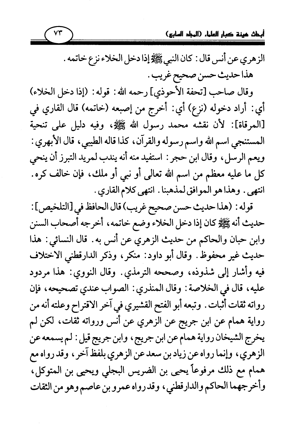 وقال صاحب [تحفة الأحوذي] رحمه الله: قوله: (إذا دخل الخلاء) أي: أراد دخوله (نزع) أي: أخرج من إصبعه (خاتمه) قال القاري في [المرقاة] : لأن نقشه محمد رسول الله صلى الله عليه وسلم، وفيه دليل على تنحية المستنجي اسم الله واسم رسوله والقرآن، كذا قاله الطيبي، قال الأبهري: ويعم الرسل، وقال ابن حجر: استفيد منه أنه يندب لمريد التبرز أن ينحي كل ما عليه معظم من اسم الله تعالى أو نبي أو ملك، فإن خالف كره. انتهى. وهذا هو الموافق لمذهبنا. انتهى كلام القاري.