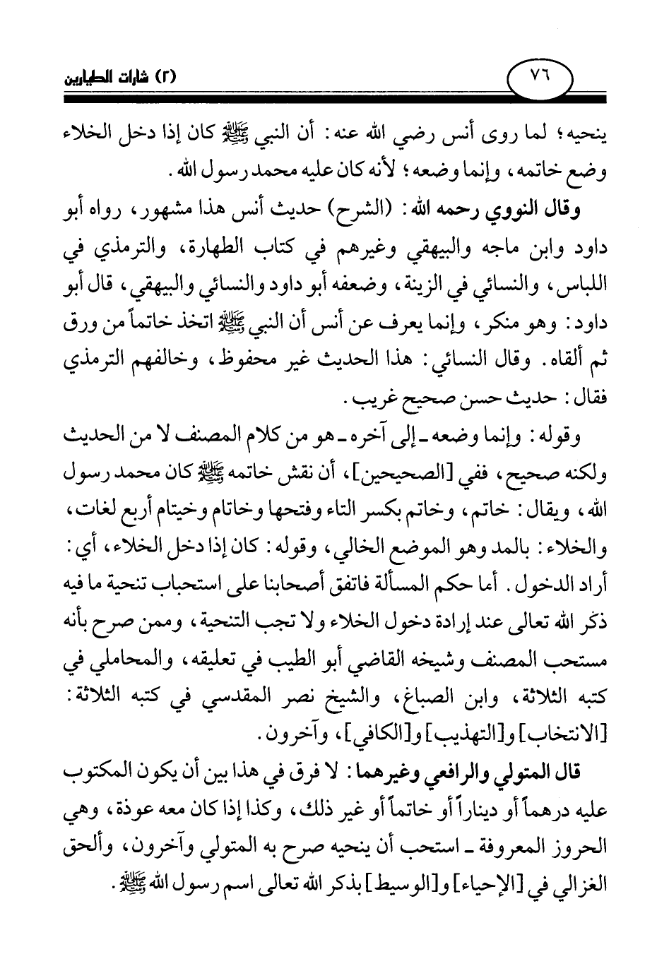 وقال النووي رحمه الله: (الشرح) حديث أنس هذا مشهور، رواه أبو داود وابن ماجه والبيهقي وغيرهم في كتاب الطهارة، والترمذي في اللباس، والنسائي في الزينة، وضعفه أبو داود والنسائي والبيهقي، قال أبو داود: وهو منكر، وإنما يعرف عن أنس أن النبي صلى الله عليه وسلم «اتخذ خاتما من ورق ثم ألقاه (¬2) » . وقال النسائي: هذا الحديث غير محفوظ، وخالفهم الترمذي فقال: حديث حسن صحيح غريب.