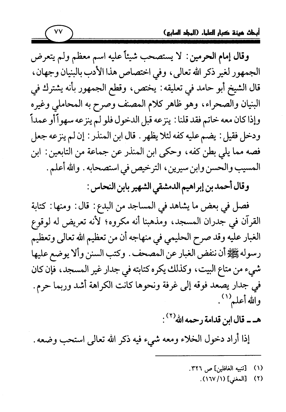 وقال إمام الحرمين: لا يستصحب شيئا عليه اسم معظم ولم يتعرض الجمهور لغير ذكر الله تعالى، وفي اختصاص هذا الأدب بالبنيان وجهان، قال الشيخ أبو حامد في تعليقه: يختص، وقطع الجمهور بأنه يشترك في البنيان والصحراء، وهو ظاهر كلام المصنف وصرح به المحاملي وغيره وإذا كان معه خاتم فقد قلنا: ينزعه قبل الدخول فلو لم ينزعه سهوا أو عمدا ودخل فقيل: يضم عليه كفه لئلا يظهر. قال ابن المنذر: إن لم ينزعه جعل فصه مما يلي بطن كفه، وحكى ابن المنذر عن جماعة من التابعين: ابن المسيب والحسن وابن سيرين، الترخيص في استصحابه. والله أعلم.