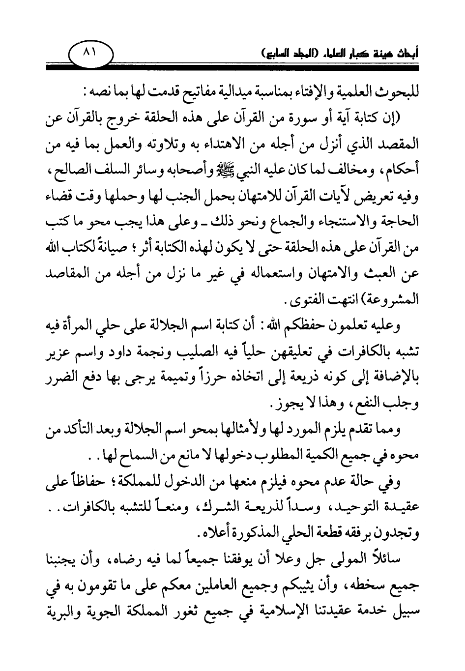 (إن كتابة آية أو سورة من القرآن على هذه الحلقة خروج بالقرآن عن المقصد الذي أنزل من أجله من الاهتداء به وتلاوته والعمل بما فيه من أحكام، ومخالف لما كان عليه النبي صلى الله عليه وسلم وأصحابه وسائر السلف الصالح، وفيه تعريض لآيات القرآن للامتهان بحمل الجنب لها وحملها وقت قضاء الحاجة والاستنجاء والجماع ونحو ذلك- وعلى هذا يجب محو ما كتب من القرآن على هذه الحلقة حتى لا يكون لهذه الكتابة أثر؛ صيانة لكتاب الله عن العبث والامتهان واستعماله في غير ما نزل من أجله من المقاصد المشروعة) انتهت الفتوى.