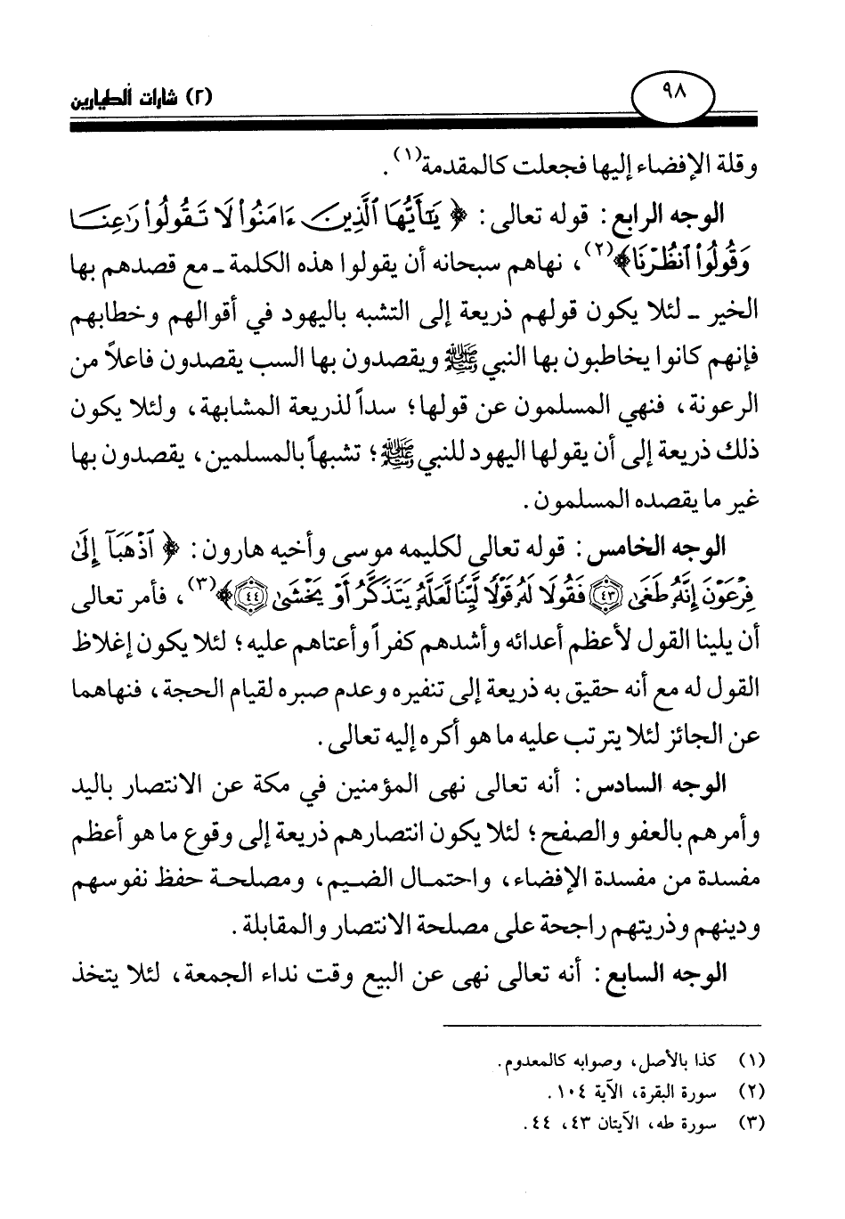 الوجه الرابع: قوله تعالى: {يَا أَيُّهَا الَّذِينَ آمَنُوا لا تَقُولُوا رَاعِنَا وَقُولُوا انْظُرْنَا} (¬2) نهاهم سبحانه أن يقولوا هذه الكلمة - مع قصدهم بها الخير- لئلا يكون قولهم ذريعة إلى التشبه باليهود في أقوالهم وخطابهم فإنهم كانوا يخاطبون بها النبي صلى الله عليه وسلم ويقصدون بها السب يقصدون فاعلا من الرعونة، فنهي المسلمون عن قولها؛ سدا لذريعة المشابهة، ولئلا يكون ذلك ذريعة إلى أن يقولها اليهود للنبي صلى الله عليه وسلم؛ تشبها بالمسلمين، يقصدون بها غير ما يقصده المسلمون.