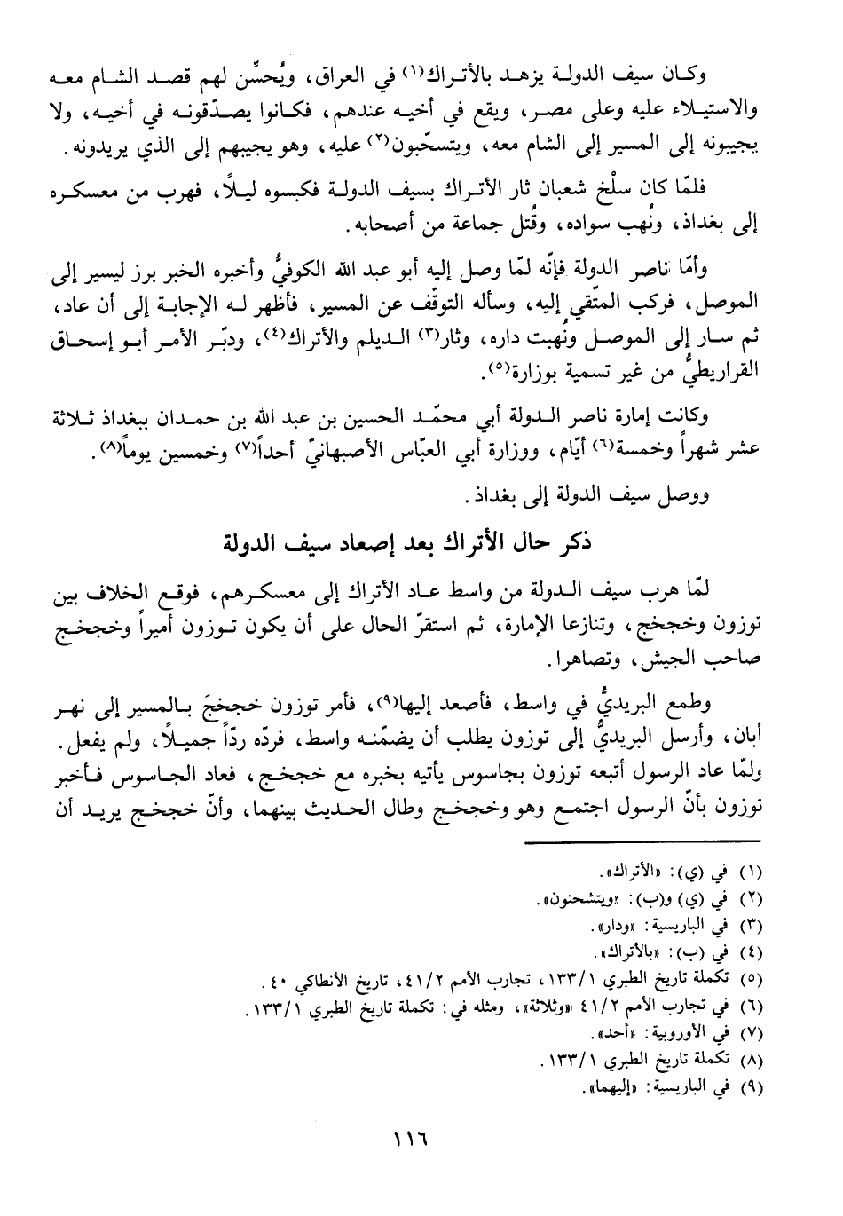 وَكَانَ سَيْفُ الدَّوْلَةِ يَزْهَدُ بِالْأَتْرَاكِ فِي الْعِرَاقِ، وَيُحْسِنُ لَهُمْ قَصْدَ الشَّامِ مَعَهُ وَالِاسْتِيلَاءَ عَلَيْهِ وَعَلَى مِصْرَ، وَيَقَعُ فِي أَخِيهِ عِنْدَهُمْ، فَكَانُوا يُصَدِّقُونَهُ فِي أَخِيهِ، وَلَا يُجِيبُونَهُ إِلَى الْمَسِيرِ إِلَى الشَّامِ مَعَهُ، وَيَتَسَحَّبُونَ عَلَيْهِ، وَهُوَ يُجِيبُهُمْ إِلَى الَّذِي يُرِيدُونَهُ.