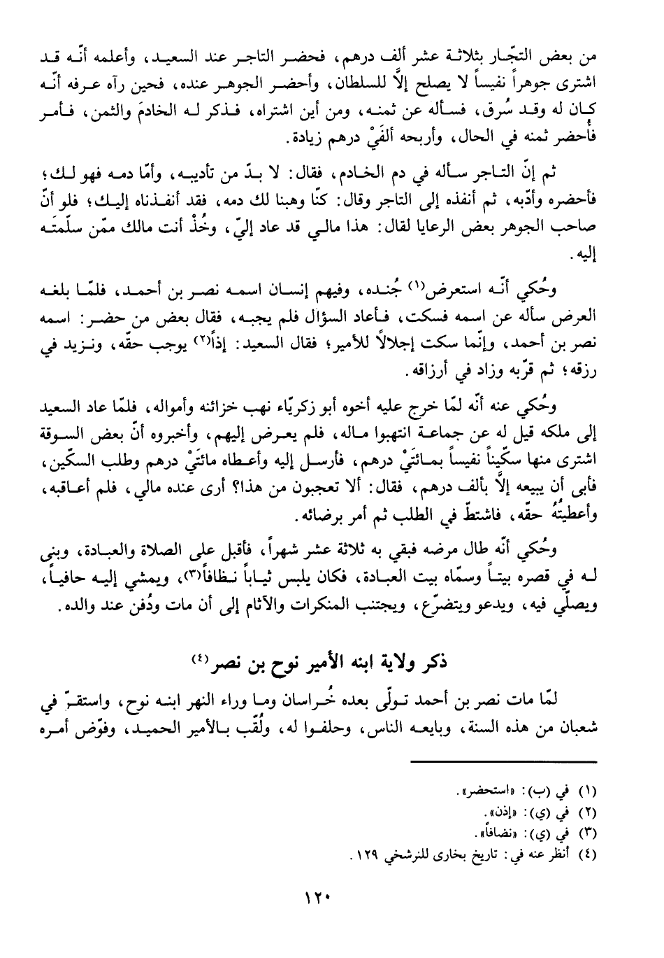 مِنْ بَعْضِ التُّجَّارِ بِثَلَاثَةَ عَشَرَ أَلْفِ دِرْهَمٍ، فَحَضَرَ التَّاجِرُ عِنْدَ السَّعِيدِ، وَأَعْلَمَهُ أَنَّهُ قَدِ اشْتَرَى جَوْهَرًا نَفِيسًا لَا يَصْلُحُ إِلَّا لِلسُّلْطَانِ، وَأَحْضَرَ الْجَوْهَرَ عِنْدَهُ، فَحِينَ رَآهُ عَرَفَهُ أَنَّهُ كَانَ لَهُ وَقَدْ سُرِقَ، فَسَأَلَهُ عَنْ ثَمَنِهِ، وَمِنْ أَيْنَ اشْتَرَاهُ، فَذَكَرَ لَهُ الْخَادِمَ وَالثَّمَنَ، فَأَمَرَ فَأُحْضِرَ ثَمَنُهُ فِي الْحَالِ، وَأَرْبَحَهُ أَلْفَيْ دِرْهَمٍ زِيَادَةً.