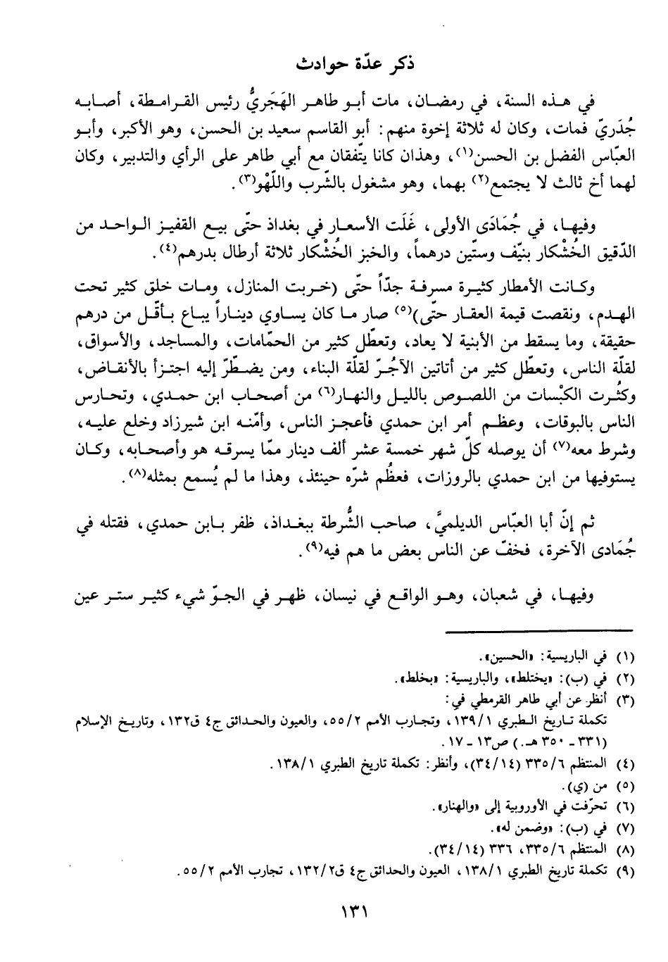 فِي هَذِهِ السَّنَةِ فِي رَمَضَانَ مَاتَ أَبُو طَاهِرٍ الْهَجَرِيُّ رَئِيسُ الْقَرَامِطَةِ، أَصَابَهُ جُدَرِيٌّ فَمَاتَ، وَكَانَ لَهُ ثَلَاثَةُ إِخْوَةٍ مِنْهُمْ: أَبُو الْقَاسِمِ سَعِيدُ بْنُ الْحَسَنِ، وَهُوَ الْأَكْبَرُ، وَأَبُو الْعَبَّاسِ الْفَضْلُ بْنُ الْحَسَنِ، وَهَذَانَ كَانَا يَتَّفِقَانِ مَعَ أَبِي طَاهِرٍ عَلَى الرَّأْيِ وَالتَّدْبِيرِ، وَكَانَ لَهُمَا أَخٌ ثَالِثٌ لَا يَجْتَمِعُ بِهِمَا، وَهُوَ مَشْغُولٌ بِالشُّرْبِ وَاللَّهْوِ.