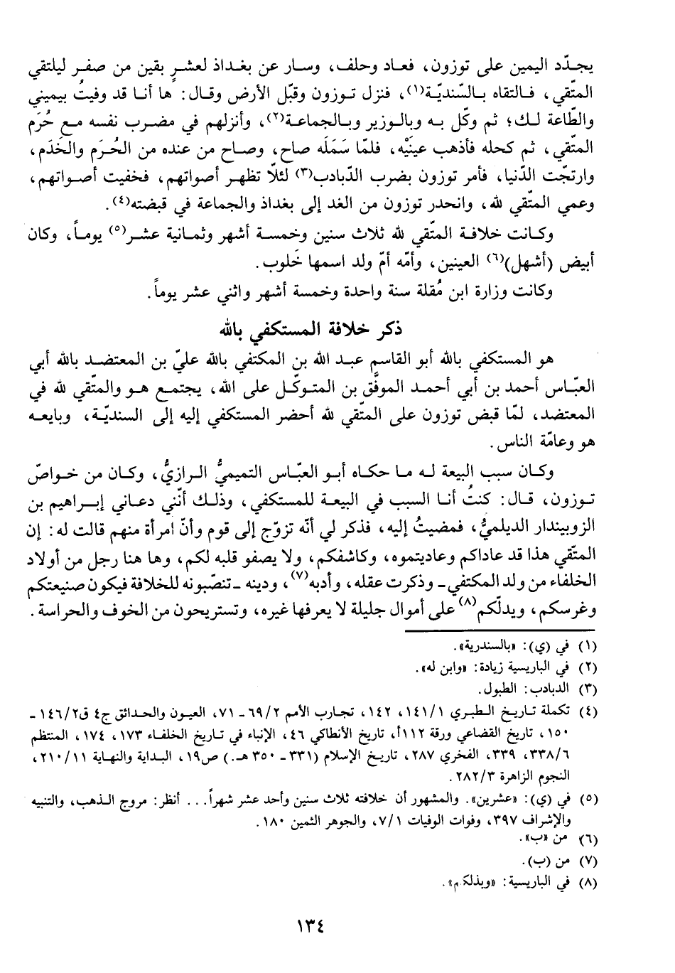 هُوَ الْمُسْتَكْفِي بِاللَّهِ أَبُو الْقَاسِمِ عَبْدُ اللَّهِ بْنُ الْمُكْتَفِي بِاللَّهِ عَلِيِّ بْنِ الْمُعْتَضِدِ بِاللَّهِ أَبِي الْعَبَّاسِ أَحْمَدَ بْنِ أَبِي أَحْمَدَ الْمُوَفَّقِ بْنِ الْمُتَوَكِّلِ عَلَى اللَّهِ، يَجْتَمِعُ هُوَ وَالْمُتَّقِي لِلَّهِ فِي الْمُعْتَضِدِ، لَمَّا قَبَضَ تُوزُونُ عَلَى الْمُتَّقِي لِلَّهِ، أَحْضَرَ الْمُسْتَكْفِيَ إِلَيْهِ إِلَى السَّنَدِيَّةِ، وَبَايَعَهُ هُوَ وَعَامَّةُ النَّاسِ.