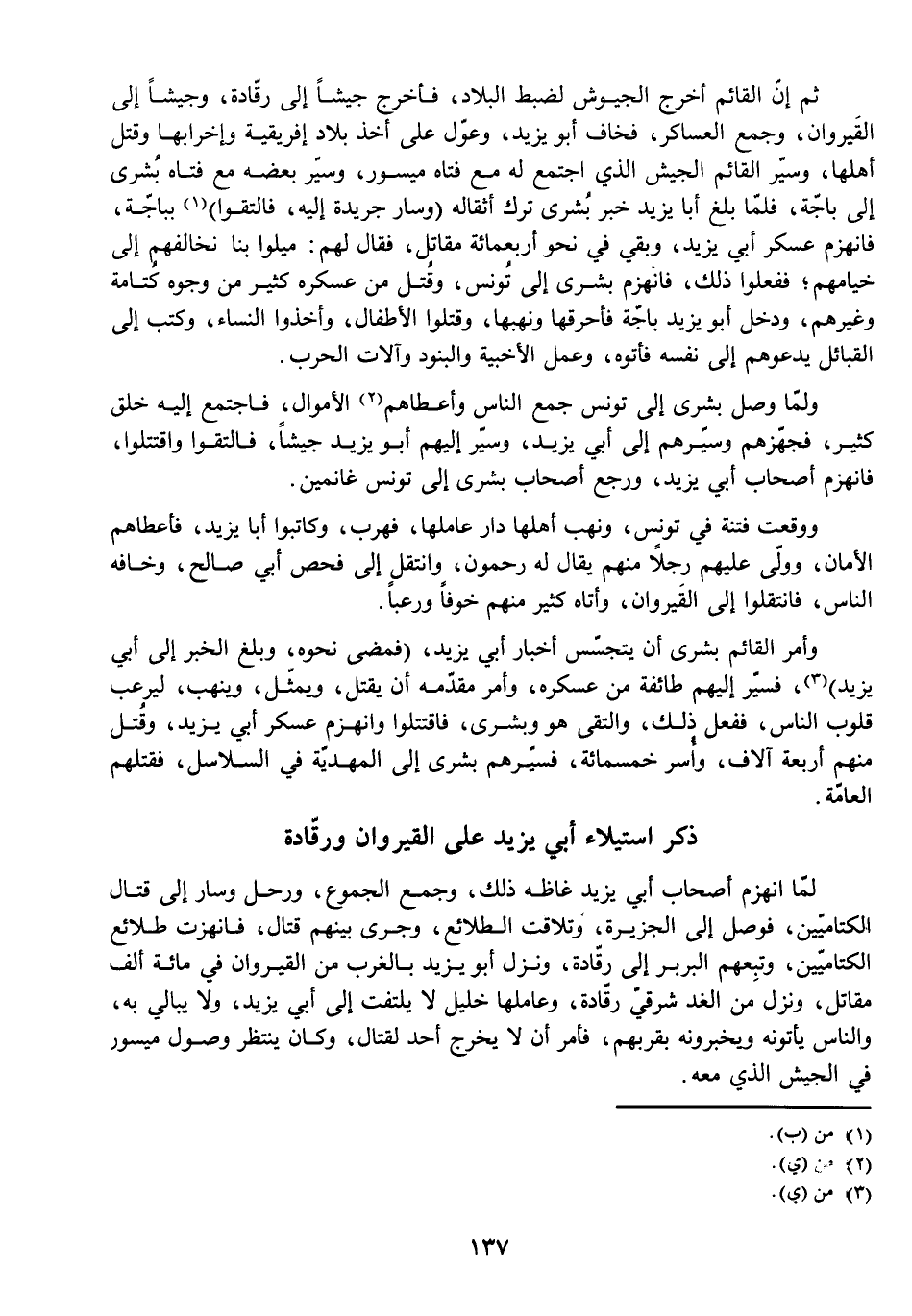 ثُمَّ إِنَّ الْقَائِمَ أَخْرَجَ الْجُيُوشَ لِضَبْطِ الْبِلَادِ، فَأَخْرَجَ جَيْشًا إِلَى رَقَّادَةَ، وَجَيْشًا إِلَى الْقَيْرَوَانِ، وَجَمَعَ الْعَسَاكِرَ، فَخَافَ أَبُو يَزِيدَ، وَعَوَّلَ عَلَى أَخْذِ بِلَادِ إِفْرِيقِيَّةَ وَإِخْرَابِهَا وَقَتْلِ أَهْلِهَا، وَسَيَّرَ الْقَائِمُ الْجَيْشَ الَّذِي اجْتَمَعَ لَهُ مَعَ فَتَاهُ مَيْسُورٍ، وَسَيَّرَ بَعْضَهُ مَعَ فَتَاهُ بُشْرَى إِلَى بَاجَّةَ، فَلَمَّا بَلَغَ أَبَا يَزِيدَ خَبَرُ بُشْرَى، تَرَكَ أَثْقَالَهُ (وَسَارَ جَرِيدَةً إِلَيْهِ، فَالْتَقَوْا) بِبَاجَّةَ، فَانْهَزَمَ عَسْكَرُ أَبِي يَزِيدَ، وَبَقِيَ فِي نَحْوِ أَرْبَعِمِائَةِ مُقَاتِلٍ، فَقَالَ لَهُمْ: مِيلُوا بِنَا نُخَالِفُهُمْ إِلَى خِيَامِهِمْ، فَفَعَلُوا ذَلِكَ، فَانْهَزَمَ بُشْرَى إِلَى تُونُسَ، وَقُتِلَ مِنْ عَسْكَرِهِ كَثِيرٌ مِنْ وُجُوهِ كُتَامَةَ وَغَيْرِهِمْ، وَدَخَلَ أَبُو يَزِيدَ بَاجَّةَ فَأَحْرَقَهَا وَنَهَبَهَا، وَقَتَلُوا الْأَطْفَالَ، وَأَخَذُوا النِّسَاءَ، وَكَتَبَ إِلَى الْقَبَائِلِ يَدْعُوهُمْ إِلَى نَفْسِهِ فَأَتَوْهُ، وَعَمِلَ الْأَخْبِيَةَ وَالْبُنُودَ وَآلَاتِ الْحَرْبِ.