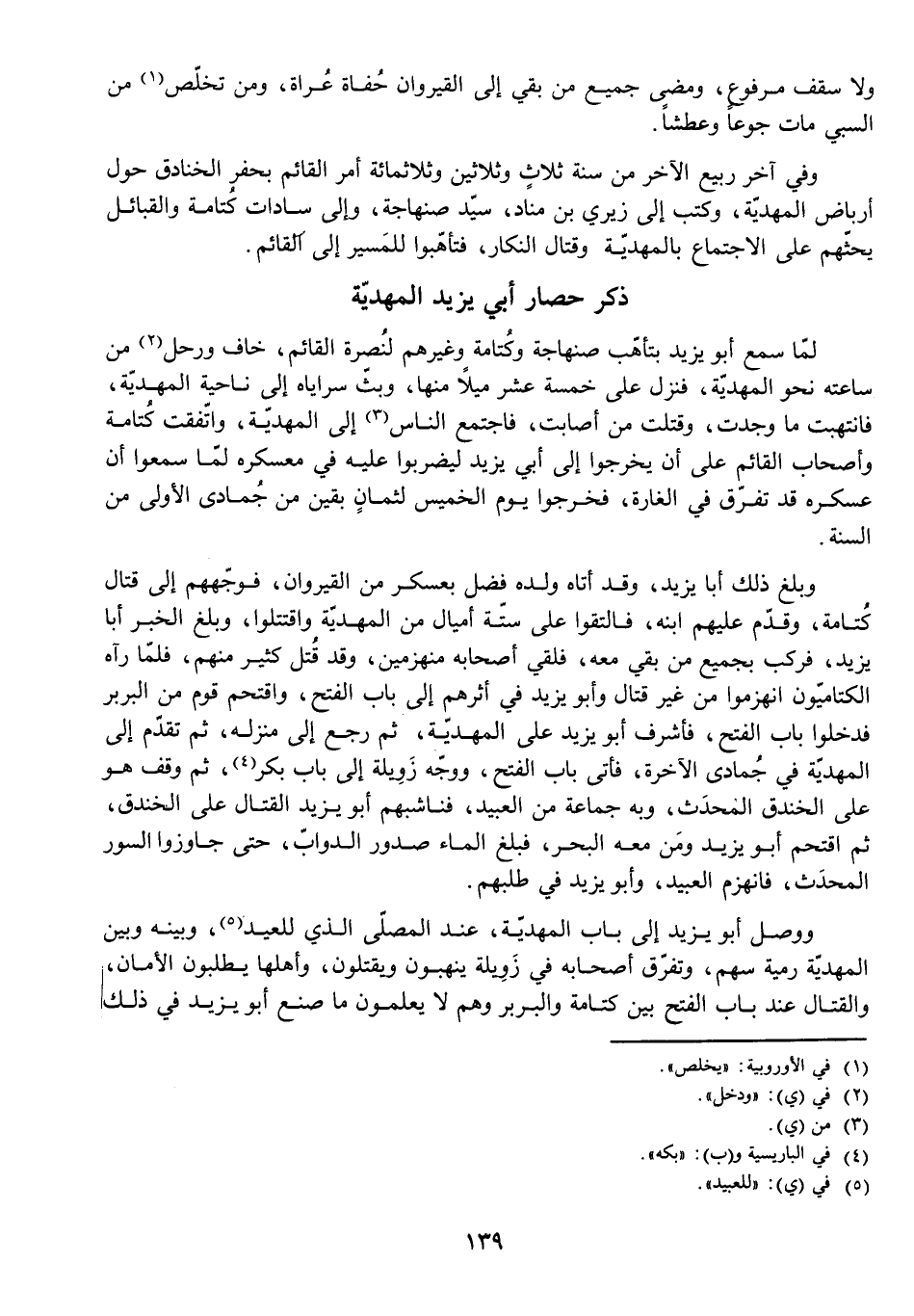 وَوَصَلَ أَبُو يَزِيدَ إِلَى بَابِ الْمَهْدِيَّةِ، عِنْدَ الْمُصَلَّى الَّذِي لِلْعِيدِ، وَبَيْنَهُ وَبَيْنَ الْمَهْدِيَّةِ رَمْيَةَ سَهْمٍ، وَتَفَرَّقَ أَصْحَابُهُ فِي زَوِيلَةَ يَنْهَبُونَ وَيَقْتُلُونَ، وَأَهْلُهَا يَطْلُبُونَ الْأَمَانَ، وَالْقِتَالُ عِنْدَ بَابِ الْفَتْحِ بَيْنَ كُتَامَةَ وَالْبَرْبَرِ وَهُمْ لَا يَعْلَمُونَ مَا صَنَعَ أَبُو يَزِيدَ فِي ذَلِكَ