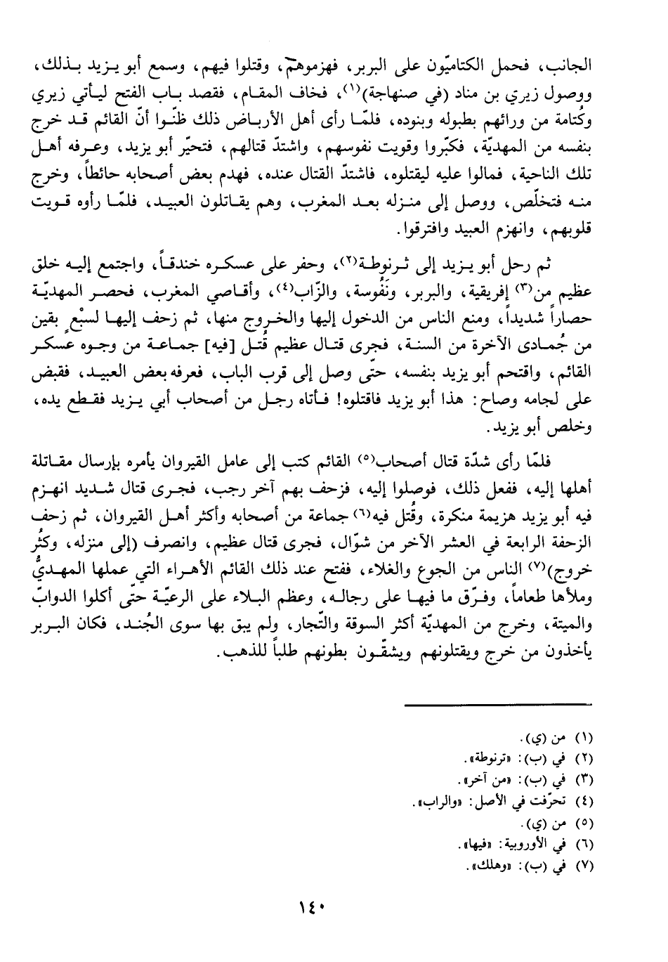 فَلَمَّا رَأَى شِدَّةَ قِتَالِ أَصْحَابِ الْقَائِمِ، كَتَبَ إِلَى عَامِلِ الْقَيْرَوَانِ يَأْمُرُهُ بِإِرْسَالِ مُقَاتِلَةِ أَهْلِهَا إِلَيْهِ، فَفَعَلَ ذَلِكَ، فَوَصَلُوا إِلَيْهِ، فَزَحَفَ بِهِمْ آخِرَ رَجَبٍ، فَجَرَى قِتَالٌ شَدِيدٌ انْهَزَمَ فِيهِ أَبُو يَزِيدَ هَزِيمَةً مُنْكَرَةً، وَقُتِلَ فِيهِ جَمَاعَةٌ مِنْ أَصْحَابِهِ وَأَكْثَرُ أَهْلِ الْقَيْرَوَانِ، ثُمَّ زَحَفَ الزَّحْفَةَ الرَّابِعَةَ فِي الْعَشْرِ الْآخَرِ مِنْ شَوَّالٍ، فَجَرَى قِتَالٌ عَظِيمٌ، وَانْصَرَفَ (إِلَى مَنْزِلِهِ، وَكَثُرَ خُرُوجُ) النَّاسِ مِنَ الْجُوعِ وَالْغَلَاءِ، فَفَتَحَ عِنْدَ ذَلِكَ الْقَائِمُ الْأَهْرَاءَ الَّتِي عَمِلَهَا الْمَهْدِيُّ وَمَلَأَهَا طَعَامًا، وَفَرَّقَ مَا فِيهَا عَلَى رِجَالِهِ، وَعَظُمَ الْبَلَاءُ عَلَى الرَّعِيَّةِ حَتَّى أَكَلُوا الدَّوَابَّ وَالْمَيْتَةَ، وَخَرَجَ مِنَ الْمَهْدِيَّةِ أَكْثَرُ السُّوقَةِ وَالتُّجَّارِ، وَلَمْ يَبْقَ بِهَا سِوَى الْجُنْدِ، فَكَانَ الْبَرْبَرُ يَأْخُذُونَ مَنْ خَرَجَ وَيَقْتُلُونَهُمْ وَيَشُقُّونَ بُطُونَهُمْ طَلَبًا لِلذَّهَبِ.