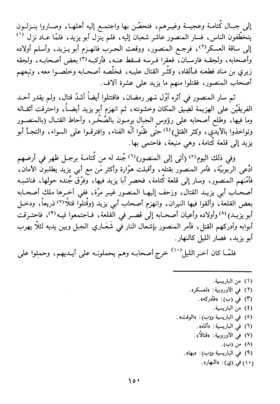 إِلَى جِبَالِ كُتَامَةَ وَعَجِيسَةَ وَغَيْرِهِمْ، فَتَحَصَّنَ بِهَا وَاجْتَمَعَ إِلَيْهِ أَهْلُهَا، وَصَارُوا يَنْزِلُونَ يَتَخَطَّفُونَ النَّاسَ، فَسَارَ الْمَنْصُورُ عَاشِرَ شَعْبَانَ إِلَيْهِ، فَلَمْ يَنْزِلْ أَبُو يَزِيدَ، فَلَمَّا عَادَ نَزَلَ إِلَى سَاقَةِ الْعَسْكَرِ، فَرَجَعَ الْمَنْصُورُ، وَوَقَعَتِ الْحَرْبُ فَانْهَزَمَ أَبُو يَزِيدَ، وَأَسْلَمَ أَوْلَادَهُ وَأَصْحَابَهُ، وَلَحِقَهُ فَارِسَانِ فَعَقَرَا فَرَسَهُ فَسَقَطَ عَنْهُ، فَأَرْكَبَهُ بَعْضَ أَصْحَابِهِ، وَلَحِقَهُ زِيرِي بْنُ مُنَادٍ فَطَعَنَهُ فَأَلْقَاهُ، وَكَثُرَ الْقِتَالُ عَلَيْهِ، فَخَلَّصَهُ أَصْحَابُهُ وَخَلَصُوا مَعَهُ، وَتَبِعَهُمْ أَصْحَابُ الْمَنْصُورِ، فَقَتَلُوا مِنْهُمْ مَا يَزِيدُ عَلَى عَشَرَةِ آلَافٍ.