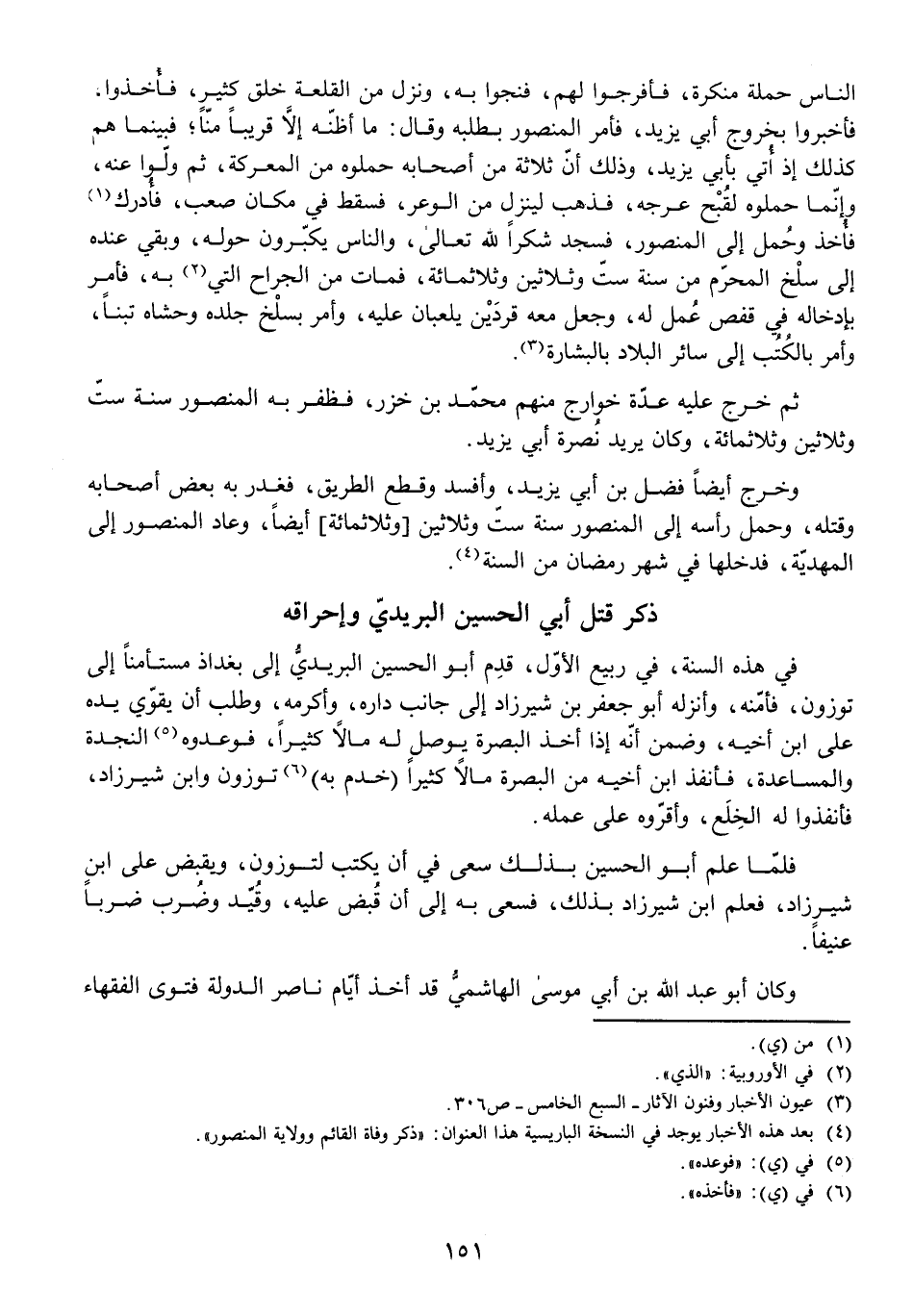 النَّاسِ حَمْلَةً مُنْكَرَةً، فَأَفْرَجُوا لَهُمْ، فَنَجَوْا بِهِ، وَنَزَلَ مِنَ الْقَلْعَةِ خَلْقٌ كَثِيرٌ، فَأُخِذُوا، فَأَخْبَرُوا بِخُرُوجِ أَبِي يَزِيدَ، فَأَمَرَ الْمَنْصُورُ يَطْلُبُهُ، وَقَالَ: مَا أَظُنُّهُ إِلَّا قَرِيبًا مِنَّا، فَبَيْنَمَا هُمْ كَذَلِكَ إِذْ أُتِيَ بِأَبِي يَزِيدَ، وَذَلِكَ أَنَّ ثَلَاثَةً مِنْ أَصْحَابِهِ حَمَلُوهُ مِنَ الْمَعْرَكَةِ ثُمَّ وَلَّوْا عَنْهُ، وَإِنَّمَا حَمَلُوهُ لِقُبْحِ عَرَجِهِ، فَذَهَبَ لِيَنْزِلَ مِنَ الْوَعْرِ، فَسَقَطَ فِي مَكَانٍ صَعْبٍ، فَأُدْرِكَ فَأُخِذَ وَحُمِلَ إِلَى الْمَنْصُورِ، فَسَجَدَ شُكْرًا لِلَّهِ - تَعَالَى، وَالنَّاسُ يُكَبِّرُونَ حَوْلَهُ، وَبَقِيَ عِنْدَهُ إِلَى سَلْخِ الْمُحَرَّمِ مِنْ سَنَةِ سِتٍّ وَثَلَاثِينَ وَثَلَاثِمِائَةٍ، فَمَاتَ مِنَ الْجِرَاحِ الَّتِي بِهِ، فَأَمَرَ بِإِدْخَالِهِ فِي قَفَصٍ عُمِلَ لَهُ، وَجَعَلَ مَعَهُ قِرْدَيْنِ يَلْعَبَانِ عَلَيْهِ، وَأَمَرَ بِسَلْخِ جِلْدِهِ وَحَشَاهُ تِبْنًا، وَأَمَرَ بِالْكُتُبِ إِلَى سَائِرِ الْبِلَادِ بِالْبِشَارَةِ.