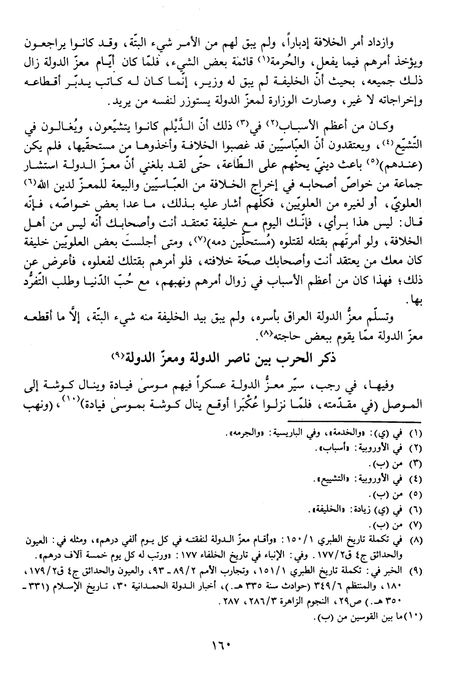 وَكَانَ مِنْ أَعْظَمِ الْأَسْبَابِ فِي ذَلِكَ أَنَّ الدَّيْلَمَ كَانُوا يَتَشَيَّعُونَ، وَيُغَالُونَ فِي التَّشَيُّعِ، وَيَعْتَقِدُونَ أَنَّ الْعَبَّاسِيِّينَ قَدْ غَصَبُوا الْخِلَافَةَ وَأَخَذُوهَا مِنْ مُسْتَحِقِّيهَا، فَلَمْ يَكُنْ (عِنْدَهُمْ) بَاعِثٌ دِينِيٌّ يَحُثُّهُمْ عَلَى الطَّاعَةِ، حَتَّى لَقَدْ بَلَغَنِي أَنَّ مُعِزَّ الدَّوْلَةِ اسْتَشَارَ جَمَاعَةً مِنْ خَوَاصِّ أَصْحَابِهِ فِي إِخْرَاجِ الْخِلَافَةِ مِنَ الْعَبَّاسِيِّينَ وَالْبَيْعَةِ لِلْمُعِزِّ لِدِينِ اللَّهِ الْعَلَوِيِّ، أَوْ لِغَيْرِهِ مِنَ الْعَلَوِيِّينَ، فَكُلُّهُمْ أَشَارَ عَلَيْهِ بِذَلِكَ مَا عَدَا بَعْضَ خَوَاصِّهِ، فَإِنَّهُ قَالَ: لَيْسَ هَذَا بِرَأْيٍ فَإِنَّكَ الْيَوْمَ مَعَ خَلِيفَةٍ تَعْتَقِدُ أَنْتَ وَأَصْحَابُكُ أَنَّهُ لَيْسَ مِنْ أَهْلِ الْخِلَافَةِ، وَلَوْ أَمَرْتَهُمْ بِقَتْلِهِ لَقَتَلُوهُ (مُسْتَحِلِّينَ دَمَهُ) ، وَمَتَى أَجْلَسْتَ بَعْضَ الْعَلَوِيِّينَ خَلِيفَةً، كَانَ مَعَكَ مَنْ يَعْتَقِدُ أَنْتَ وَأَصْحَابُكَ صِحَّةَ خِلَافَتِهِ، فَلَوْ أَمَرَهُمْ بِقَتْلِكَ لَفَعَلُوهُ، فَأَعْرِضْ عَنْ ذَلِكَ، فَهَذَا كَانَ مِنْ أَعْظَمِ الْأَسْبَابِ فِي زَوَالِ أَمْرِهِمْ وَنَهْبِهِمْ مَعَ حُبِّ الدُّنْيَا وَطَلَبِ التَّفَرُّدِ بِهَا.