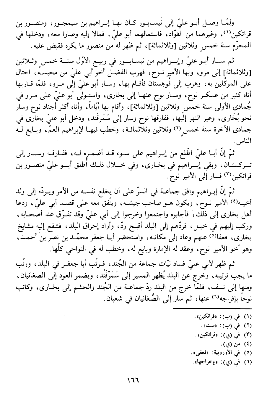 ثُمَّ إِنَّ أَبَا عَلِيٍّ اطَّلَعَ مِنْ إِبْرَاهِيمَ عَلَى سُوءٍ قَدْ أَضْمَرَهُ لَهُ، فَفَارَقَهُ وَسَارَ إِلَى تِرْكِسْتَانَ، وَبَقِيَ إِبْرَاهِيمُ فِي بُخَارَى، وَفِي خِلَالِ ذَلِكَ أَطْلَقَ أَبُو عَلِيٍّ مَنْصُورَ بْنَ قَرَاتَكِينَ، فَسَارَ إِلَى الْأَمِيرِ نُوحٍ.
