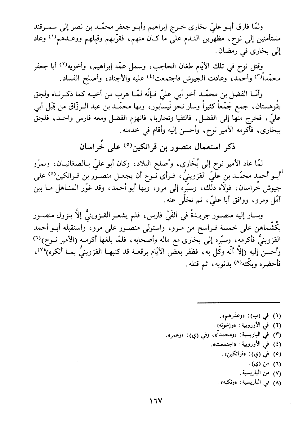 لَمَّا عَادَ الْأَمِيرُ نُوحٌ إِلَى بُخَارَى وَأَصْلَحَ الْبِلَادَ، وَكَانَ أَبُو عَلِيٍّ بِالصَّغَانِيَانِ، وَبِمَرْوَ أَبُو أَحْمَدَ مُحَمَّدُ بْنُ عَلِيٍّ الْقَزْوِينِيُّ، فَرَأَى نُوحٌ أَنْ يَجْعَلَ مَنْصُورَ بْنَ قَرَاتَكِينَ عَلَى جُيُوشِ خُرَاسَانَ، فَوَلَّاهُ ذَلِكَ، وَسَيَّرَهُ إِلَى مَرْوَ وَبِهَا أَبُو أَحْمَدَ، وَقَدْ غَوَّرَ الْمَنَاهِلَ مَا بَيْنَ آمُلَ وَمَرْوَ، وَوَافَقَ أَبَا عَلِيٍّ ثُمَّ تَخَلَّى عَنْهُ.