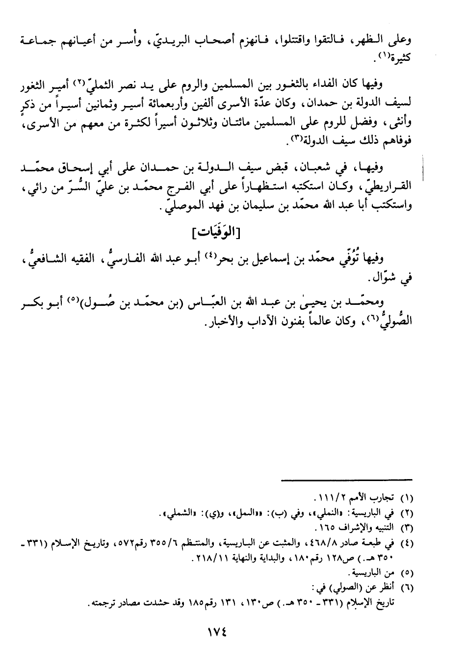 وَفِيهَا كَانَ الْفِدَاءُ بِالثُّغُورِ بَيْنَ الْمُسْلِمِينَ وَالرُّومِ عَلَى يَدِ نَصْرِ الثَّمَلِيِّ أَمِيرِ الثُّغُورِ لِسَيْفِ الدَّوْلَةِ بْنِ حَمْدَانَ، وَكَانَ عِدَّةُ الْأَسْرَى أَلْفَيْنِ وَأَرْبَعِمِائَةِ أَسِيرٍ وَثَمَانِينَ أَسِيرًا مَنْ ذَكَرٍ وَأُنْثَى، وَفَضَلَ لِلرُّومِ عَلَى الْمُسْلِمِينَ مِائَتَانِ وَثَلَاثُونَ أَسِيرًا لِكَثْرَةِ مِنْ مَعَهُمْ مِنَ الْأَسْرَى، فَوَفَّاهُمْ ذَلِكَ سَيْفُ الدَّوْلَةِ.