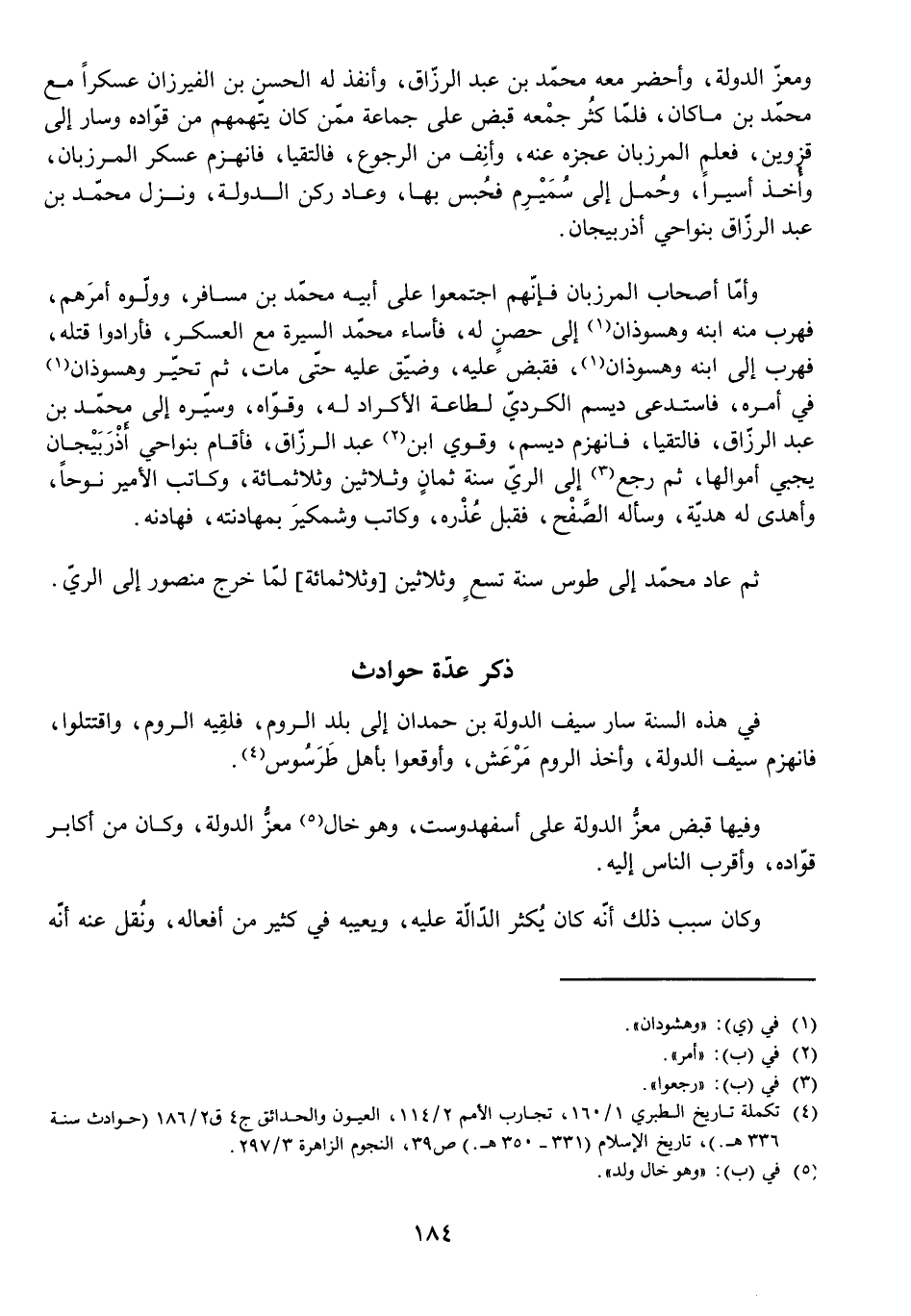 وَأَمَّا أَصْحَابُ الْمَرْزُبَانِ فَإِنَّهُمُ اجْتَمَعُوا عَلَى أَبِيهِ مُحَمَّدِ بْنِ مُسَافِرٍ، وَوَلُّوهُ أَمْرَهُمْ، فَهَرَبَ مِنْهُ ابْنُهُ وَهْسُوذَانُ إِلَى حِصْنٍ لَهُ، فَأَسَاءَ مُحَمَّدُ السِّيرَةَ مَعَ الْعَسْكَرِ، فَأَرَادُوا قَتْلَهُ، فَهَرَبَ إِلَى ابْنِهِ وَهْسُوذَانَ، فَقَبَضَ عَلَيْهِ، وَضَيَّقَ عَلَيْهِ حَتَّى مَاتَ، ثُمَّ تَحَيَّرَ وَهْسُوذَانُ فِي أَمْرِهِ، فَاسْتَدْعَى دَيْسَمَ الْكُرْدِيَّ لِطَاعَةِ الْأَكْرَادِ لَهُ، وَقَوَّاهُ، وَسَيَّرَهُ إِلَى مُحَمَّدِ بْنِ عَبْدِ الرَّزَّاقِ، فَالْتَقَيَا، فَانْهَزَمَ دَيْسَمُ، وَقَوِيَ ابْنُ عَبْدِ الرَّزَّاقِ، فَأَقَامَ بِنَوَاحِي أَذْرَبِيجَانَ يَجْبِي أَمْوَالَهَا، ثُمَّ رَجَعَ إِلَى الرَّيِّ سَنَةَ ثَمَانٍ وَثَلَاثِينَ وَثَلَاثِمِائَةٍ، وَكَاتَبَ الْأَمِيرَ نُوحًا، وَأَهْدَى لَهُ هَدِيَّةً، وَسَأَلَهُ الصَّفْحَ، فَقَبِلَ عُذْرَهُ، وَكَاتَبَ وَشْمَكِيرَ بِمُهَادَنَتِهِ، فَهَادَنَهُ، ثُمَّ عَادَ مُحَمَّدٌ إِلَى طُوسَ سَنَةَ تِسْعٍ وَثَلَاثِينَ [وَثَلَاثِمِائَةٍ] لَمَّا خَرَجَ مَنْصُورٌ إِلَى الرَّيِّ.