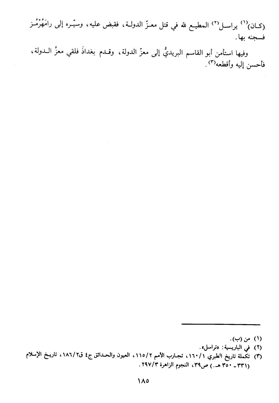(كَانَ) يُرَاسِلُ الْمُطِيعَ لِلَّهِ فِي قَتْلِ مُعِزِّ الدَّوْلَةِ، فَقَبَضَ عَلَيْهِ، وَسَيَّرَهُ إِلَى رَامَهُرْمُزَ فَسَجَنَهُ بِهَا.
